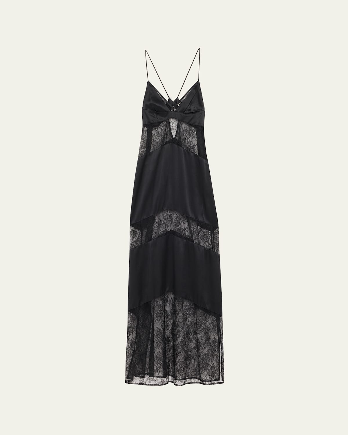 Livy "Sully" ultra graphic maxi dress combines silk satin with tiers of delicate floral lace V neckline Sleeveless Midback cutout Hem side slits Ankle length Aline silhouette Invisible side zipper Nylon/polyamide/silk/elastane Imported
