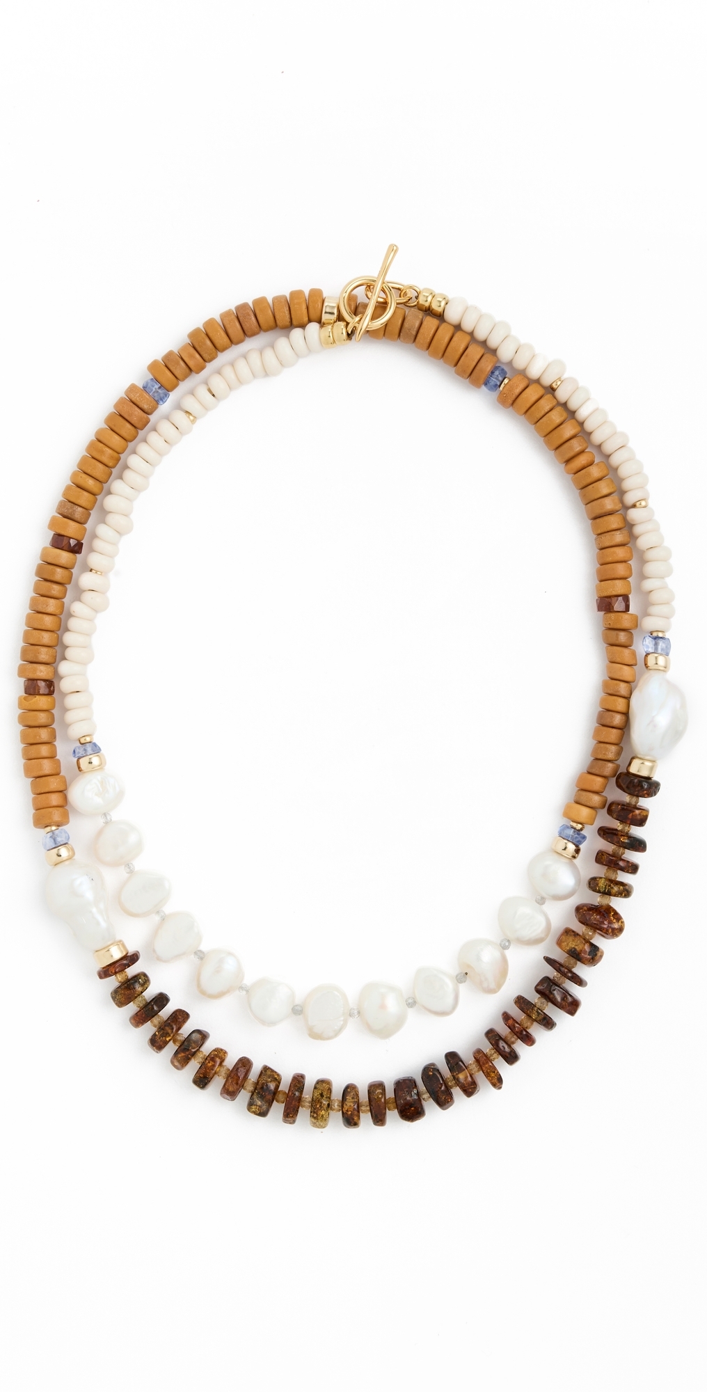 Gold-tone hardware. Glass and heishi beads. Freshwater cultured pearls. Ring and toggle closure. Made in the USA. Measurements: Length: 35in / 89.0cm