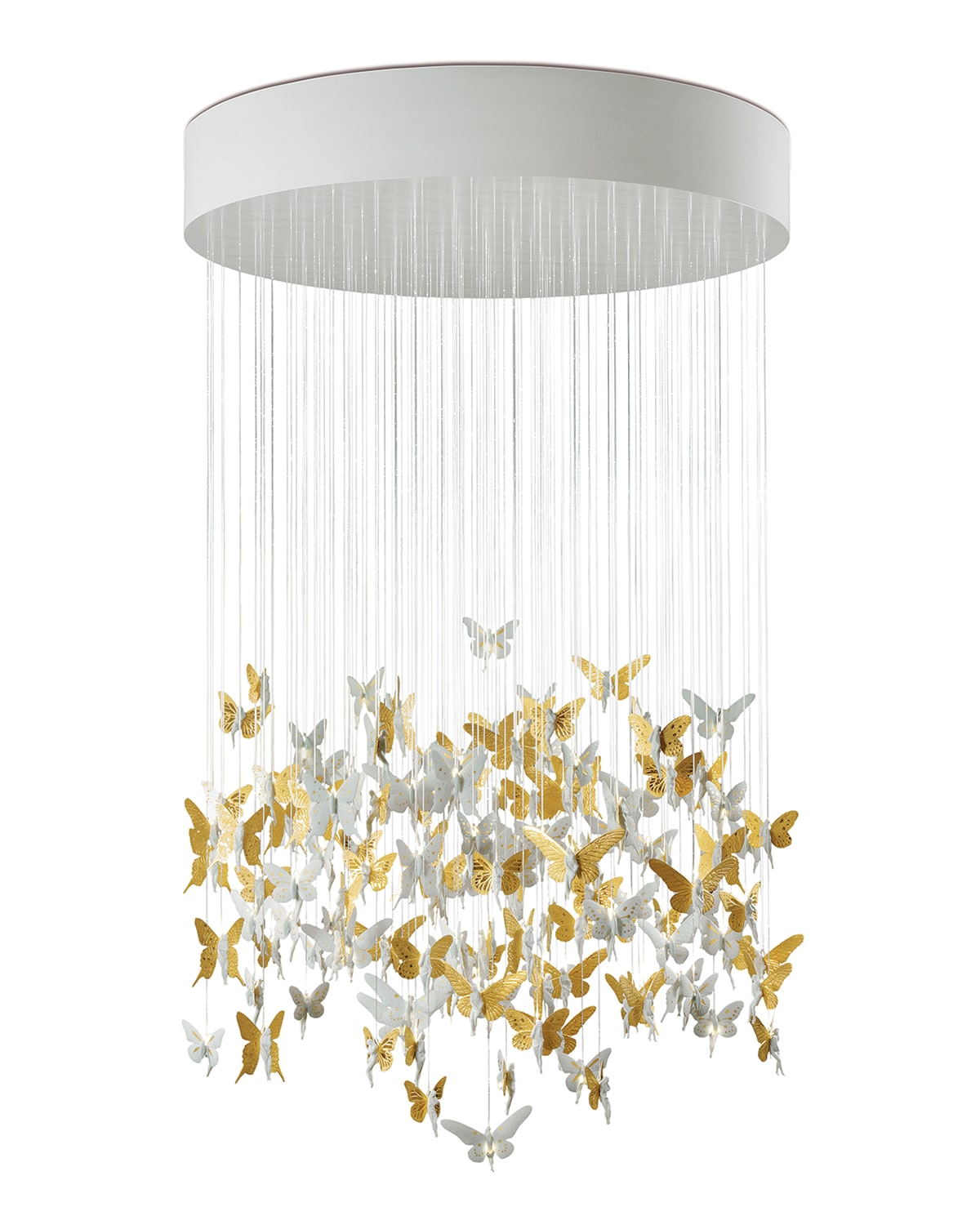 Ceiling lamp with handcrafted white matte porcelain fairies and golden luster cascading down 1.35 m on a fiber optic with subtle points of light. Designed by Bodo Sperlein. Within the ReCyclos project, the German designer Bodo Sperlein takes as inspiration Lladró's iconic fairies to create for the brand contemporary chandeliers. Each one of these fairies is handmade following Lladró's entirely artisan process of production. Creativity combined with the latest in fiber optic technology to produce subtle points of light that fall in cascade. This version is enriched with golden luster, hand applied in a complex technique which requires double firing in order to fix the color and to achieve the luminosity. Made of handpainted porcelain. LED integrated bulbs, not wireless, fiber optic technology. Approx. 53.15"Dia. x 82.67"T. Weight: 436.5 lbs. Wipe clean with cloth. Made in Spain. Boxed weight, approximately 440 lbs.