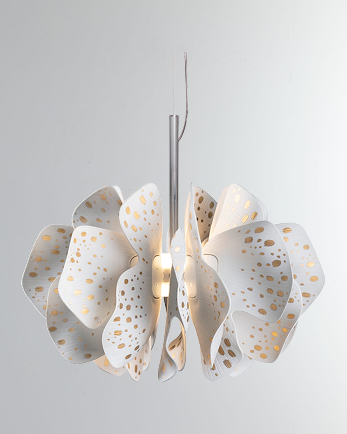 Porcelain ceiling lamp from the Nightbloom Collection, created by Lladró in collaboration with the Dutch designer Marcel Wanders. Delicate petals that seem to sway in the breeze inspire unique and innovative pieces. The petals of the lamp are made in white matte porcelain decorated with details in golden luster. The rest of the components are aluminum and zincplated steel. A contemporary design with great decorative potential, handcrafted in the Lladró workshops in Spain. Uses two 48watt integrated LED module bulbs; dimmable. Approx. 18.5"Dia. x 66.9"T. Weight: 17 lbs. Boxed weight, approximately 23 lbs.