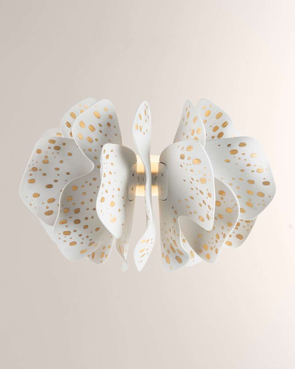 Porcelain standing lamp from the Nightbloom Collection, created by Lladró in collaboration with the Dutch designer Marcel Wanders. Delicate petals that seem to sway in the breeze inspire unique and innovative pieces. The petals of the lamp are made in white matte porcelain decorated with details in golden luster. The rest of the components are aluminum and zincplated steel. A contemporary design with great decorative potential, handcrafted in the Lladró workshops in Spain. Approx. 18.5"W x 11.4"D x 12.9"T. Uses two 48LED module integrated bulbs; dimmable. Boxed weight, approximately 15 lbs.