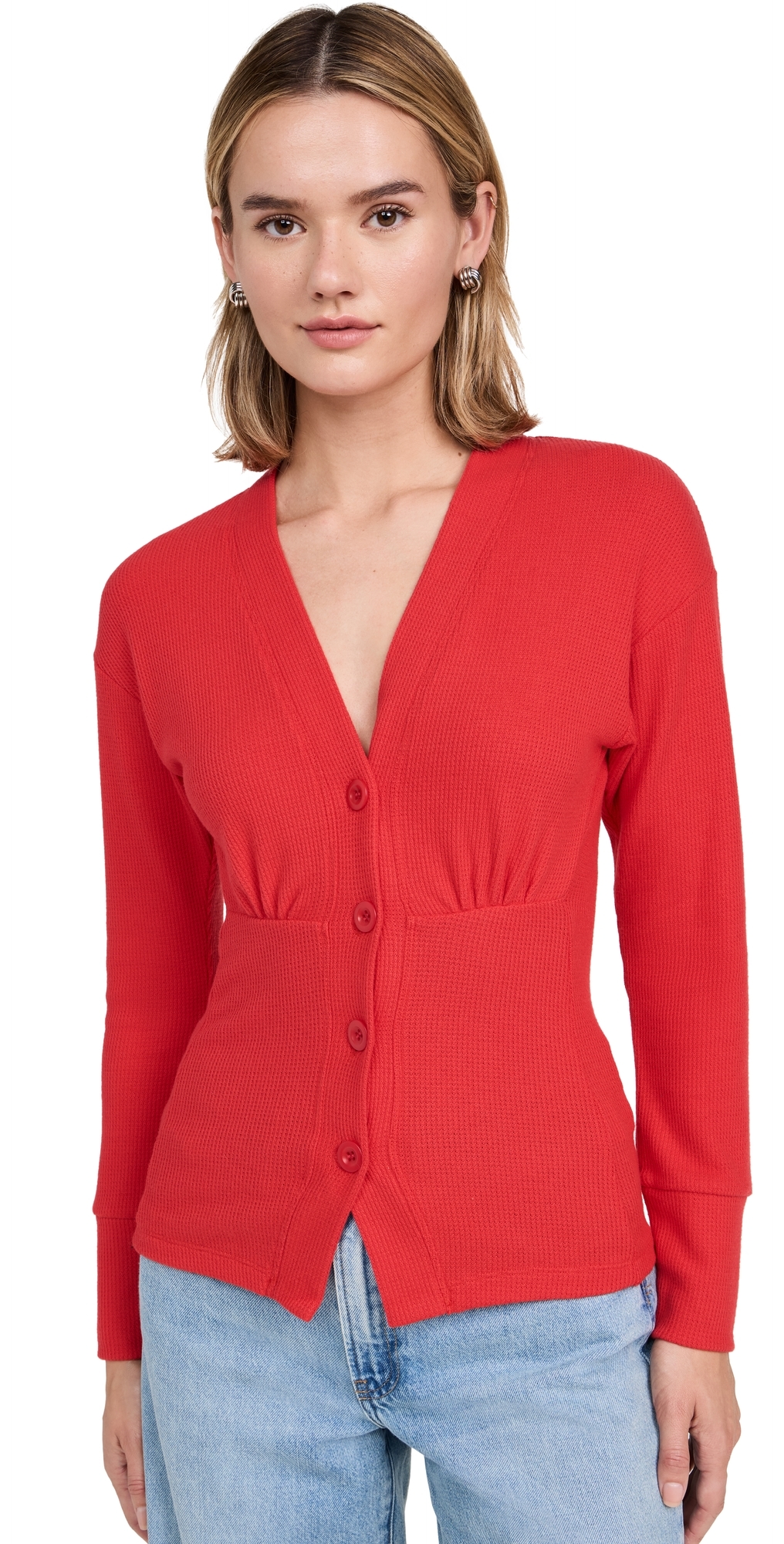Fabric: Lightweight waffle knit. Gathered bust. V neck. Long sleeves. Button placket. Shell: 68% polyester/31% rayon/1% spandex. Wash cold. Imported, China. Measurements: Measurements from size XS Length: 23.5in / 60.0cm, from shoulder