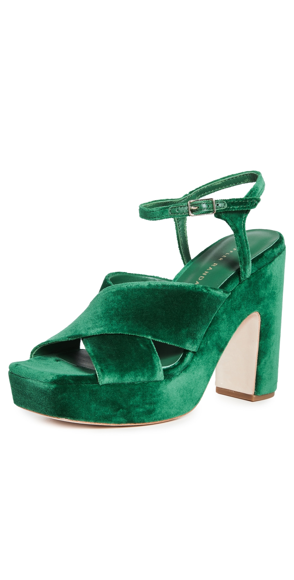 Fabric: Velvet. Crisscross straps. Leather footbed. Chunky heel. Buckle ankle strap with elastic inset. Leather sole with rubber heel cap. Imported, China. This item cannot be gift-boxed. Measurements: Heel: 4.75in / 120mm Platform: 1.5in / 35mm