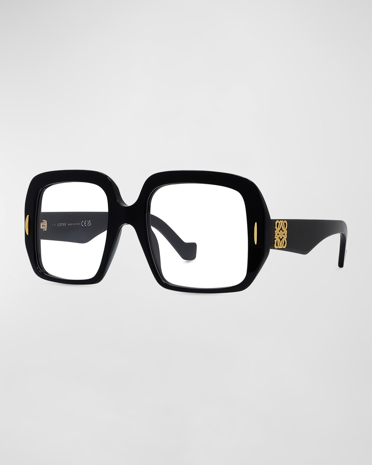 Loewe oversized square glasses in acetate Lens/bridge/temple (in mm): 5220140 Metal pins on a flat frame Saddle nose bridge Anagram on temples Thin, tapered arms Hand wash 100% UVA/UVB protection Made in Italy