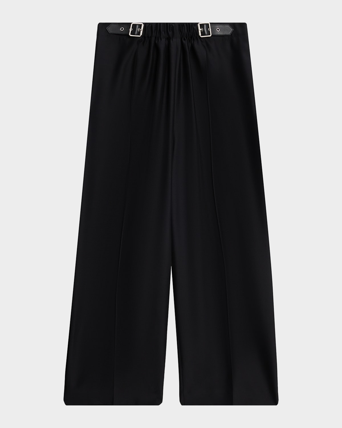 Loewe trousers feature a double buckle belt cinched with and pintuck front seams High rise Back buttonwelt pocket Logo leather patch on the back Wide legs Full length Pullon style Wool/leather/silk Made in Italy