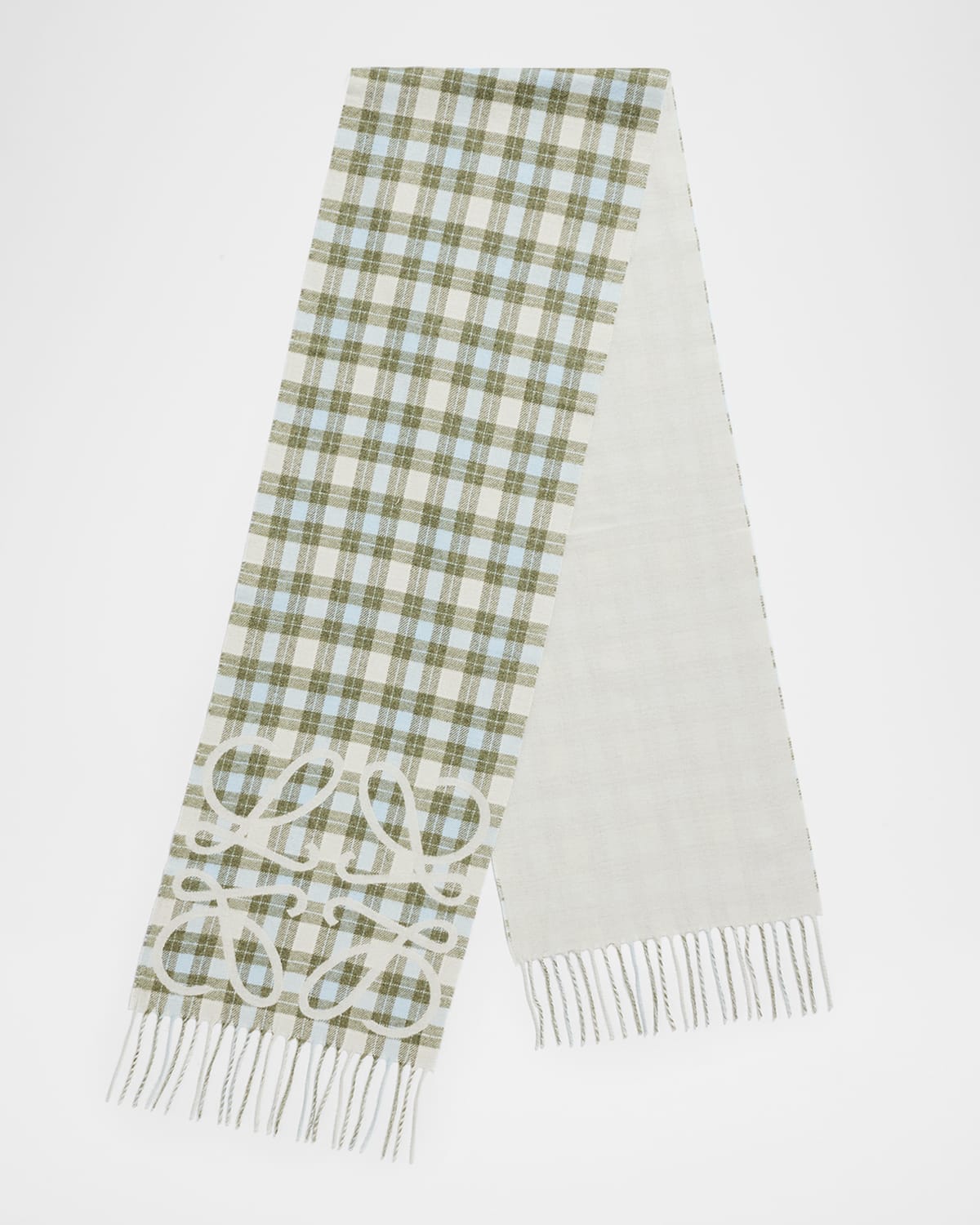 Loewe check printed scarf with a solid anagram intarsia Approx. 70.9"L x 11"W Fringed ends May be styled multiple ways Silk/cashmere Professional cleaning recommended Made in Italy