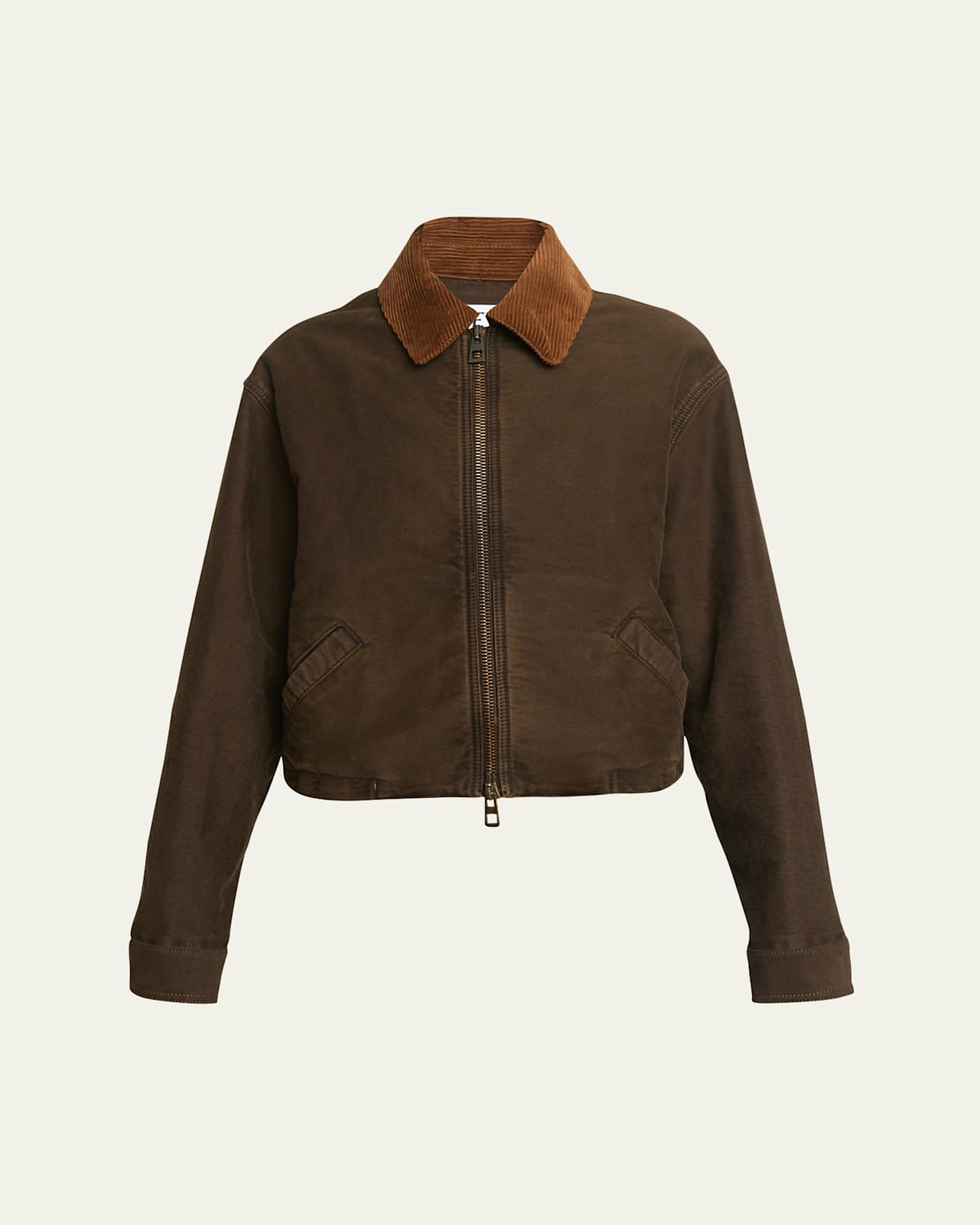 Loewe corduroy collared jacket with plaid sleeve detail and lambskin leather trim Spread collar; twoway zip front Long Sleeves; snapbutton cuffs Side pockets Relaxed fit Cotton Made in Italy