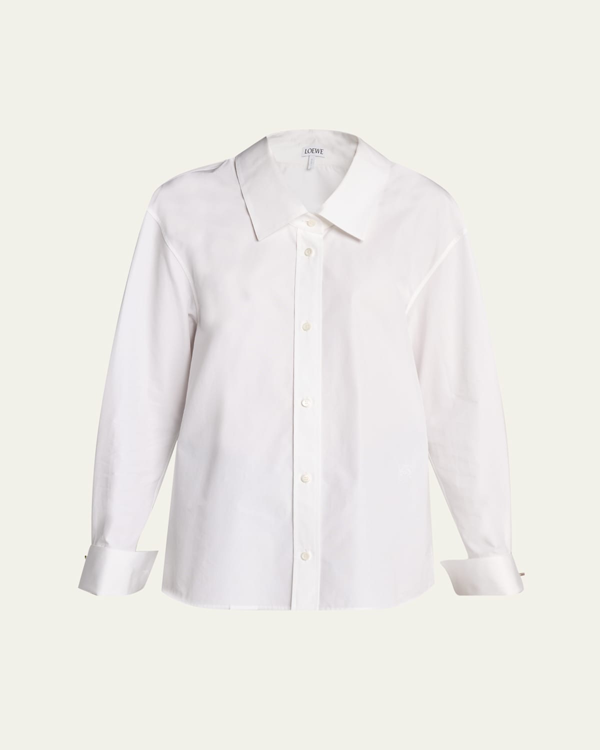 Loewe classic collared shirt featuring enameled and crystal embellished cuff links Point collar; concealed button front Long sleeves French cuffs Yoked back; box pleat Loose fit Straight hem Cotton/polyester/leather Made in Italy
