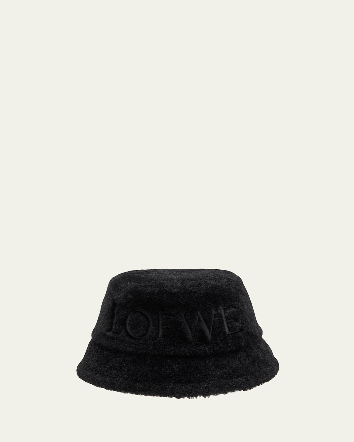 Loewe graphic bucket hat in sheep shearling, cotton, and linen Flat crown Embroidered logo Downturned brim Made in Spain