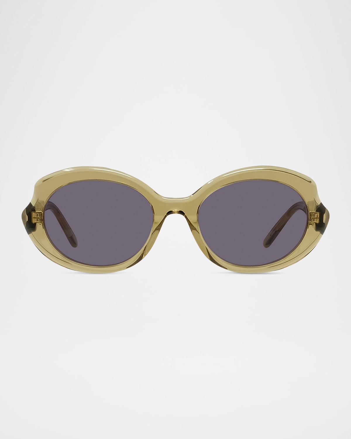 Loewe ovalshaped sunglasses crafted of translucent acetate for a modern, minimalist effect Eye/bridge/temple (in mm): 5420140 Monochromatic lenses Saddle nose bridge Goldtone branded lettering at temples Thin, tapered arms 100% UVA/UVB protection Acetate Hand wash Made in Italy