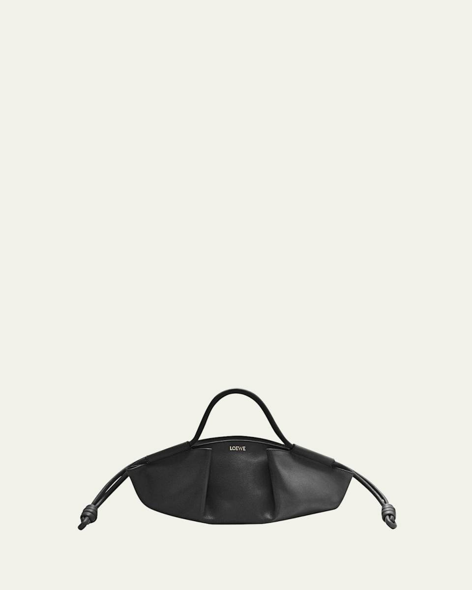 Loewe "Paseo" top handle bag in calf leather Rolled top handles Detachable, adjustable shoulder strap Can be worn as a clutch, top handle, or shoulder bag Drawstring side closure; zip top closure Approx. 8.3"H x 13.8"W x 4.5"D Made in Spain