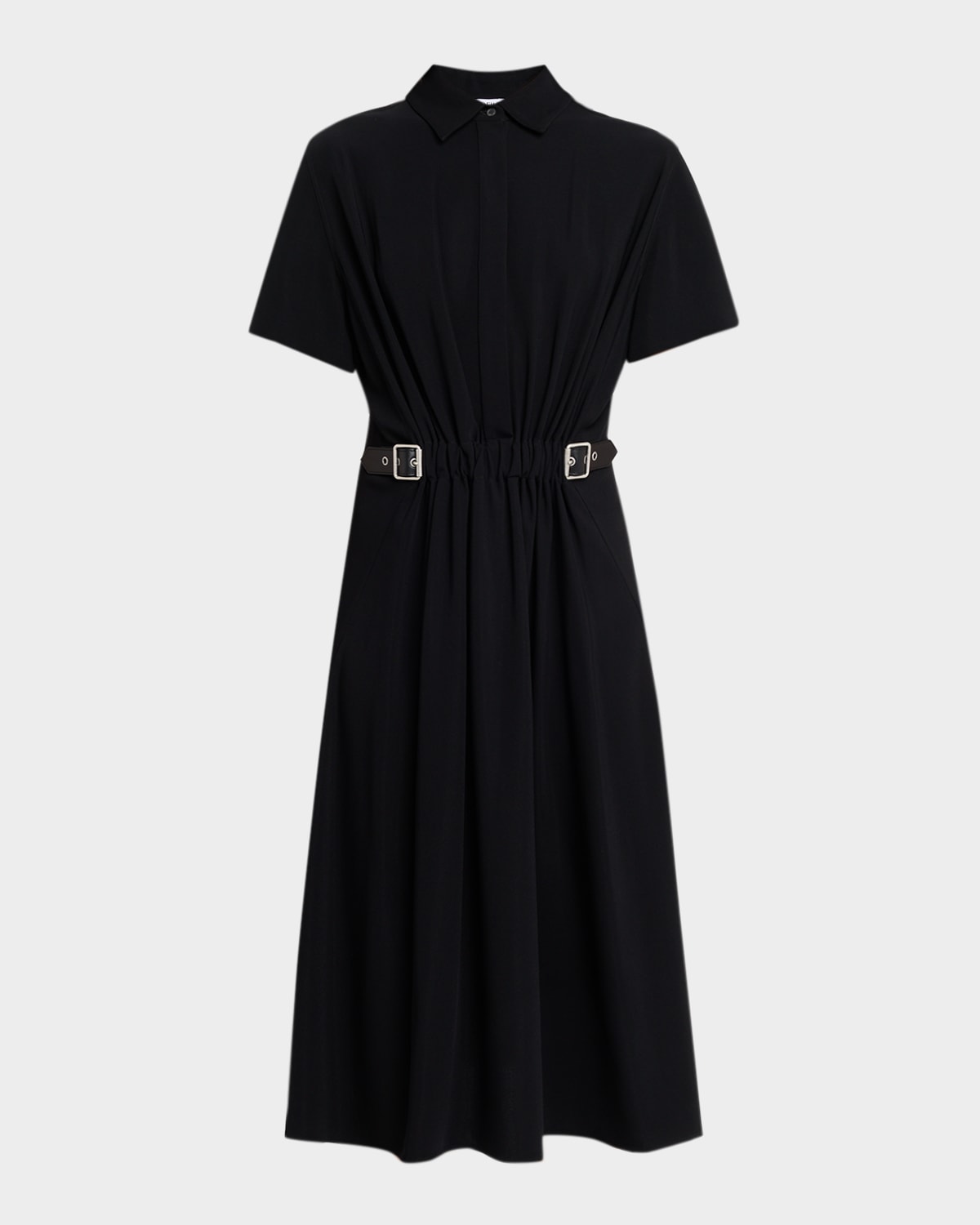Loewe shirtdress is crafted of a flowy viscose jersey cinched at the waist with a double buckle belt Point collar; concealed button front Short sleeves Aline silhouette Knee length Viscose/polyester Made in Italy