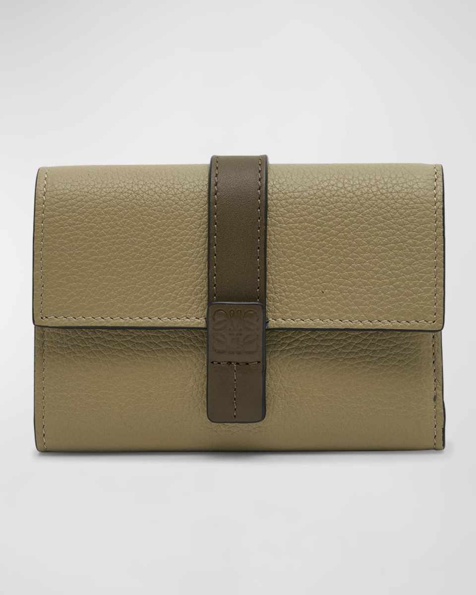 Loewe wallet in calf leather Flap top with snap closure; embossed Anagram accent Interior, six card slots, four slip pockets, and one bill compartment Approx. 4"H x 1.5"W x 3.1"D Made in Spain