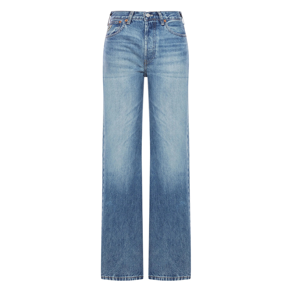 blue five-pocket design zip fly button fastening belt loops back logo patch straight hem