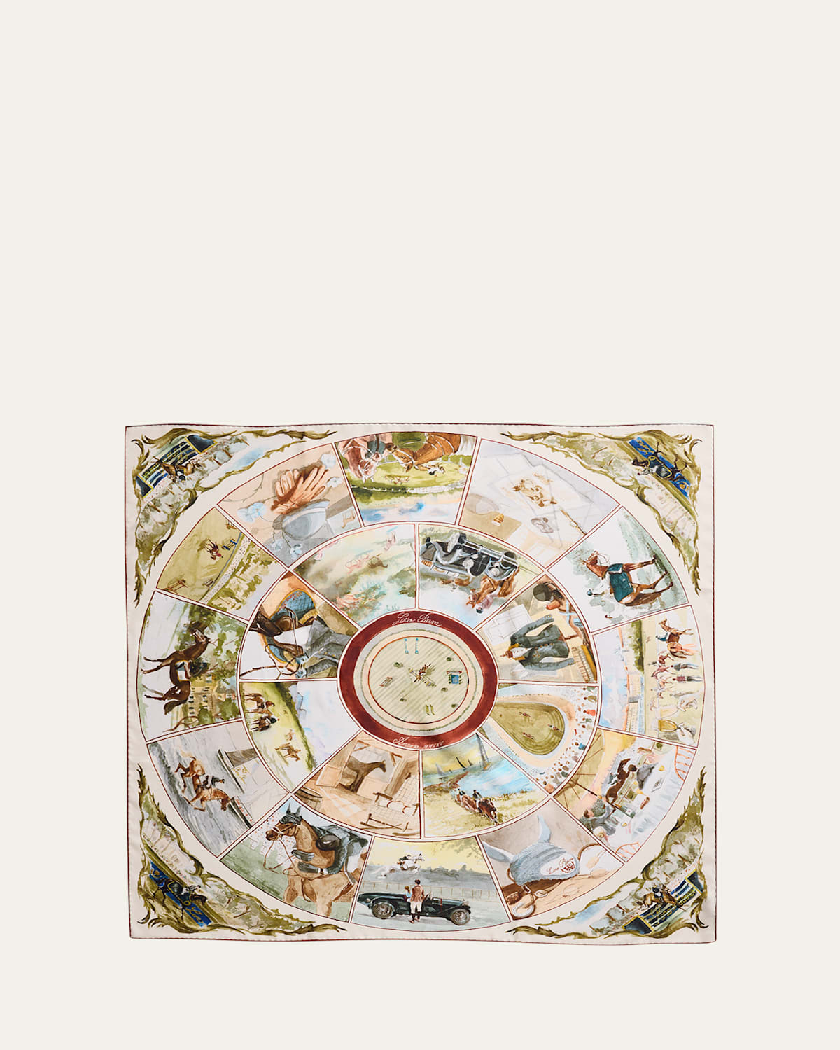 Loro Piana foulard features various scenic prints with an equestrian motif Approx. 35.43"Sq. Handrolled edges May be styled multiple ways Silk Dry clean Made in Italy