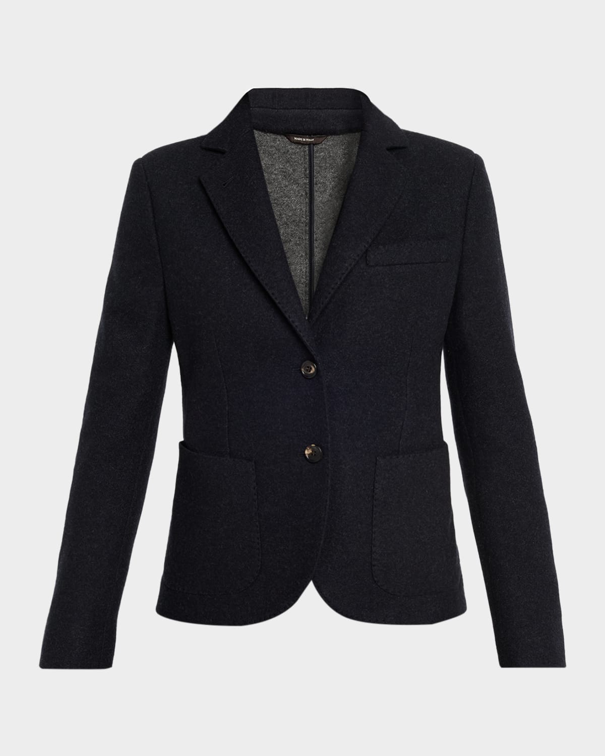 Loro Piana lightweight knit sweater jacket Notch lapels; button front Long sleeves; button cuffs Chest pocket; waist patch pockets Straight fit Doublevented back Cashmere Cupro lining Dry clean Leather trim Made in Italy