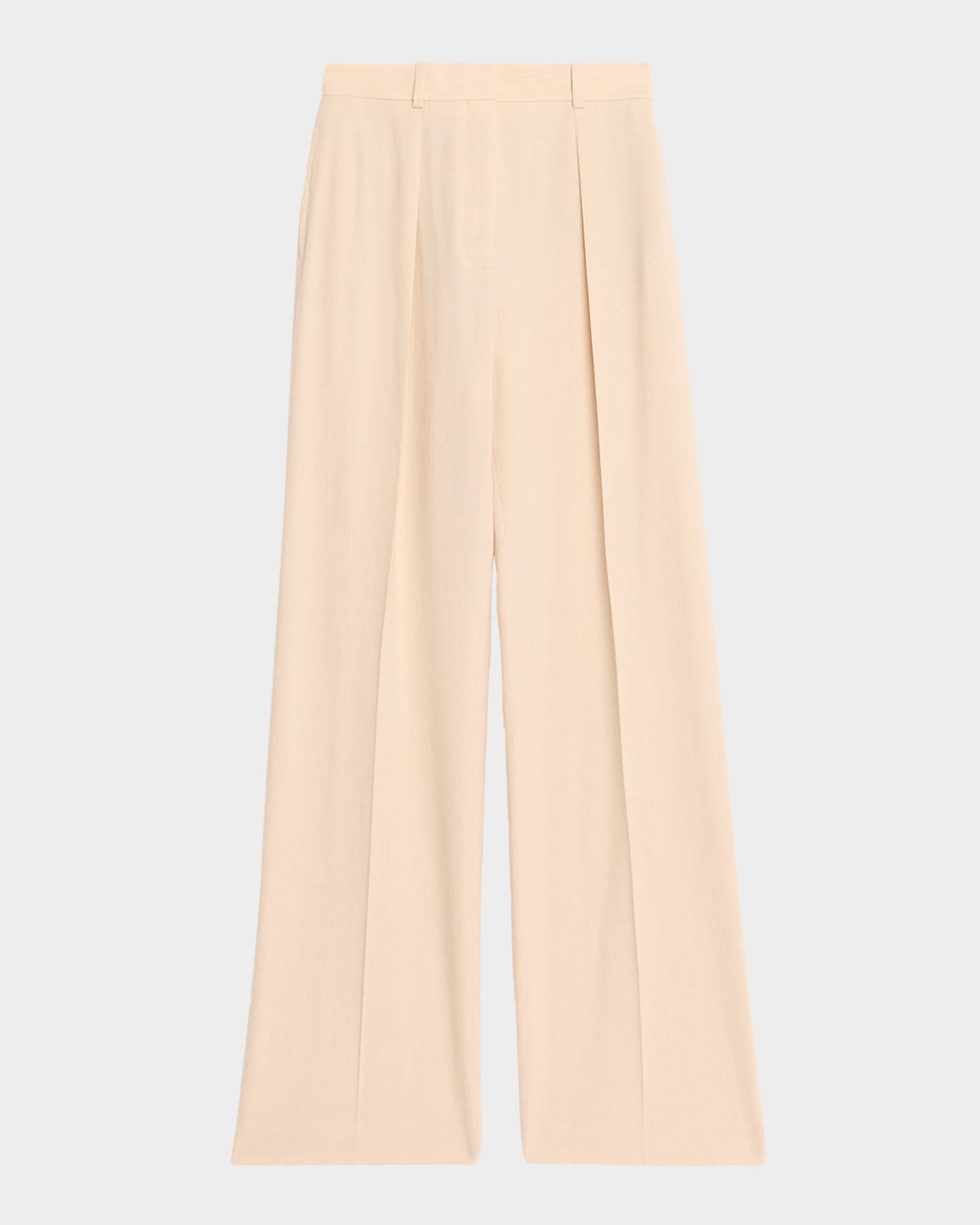 These Loro Piana "Edward" trousers combine textured linen with wool crepe for rich texture and handfeel Highrise sits high on the hips Pleated front Onseam pockets Back welt pockets Full length Wide legs Hook and button/zip fly; belt loops Flax/virgin wool Dry clean Made in Italy