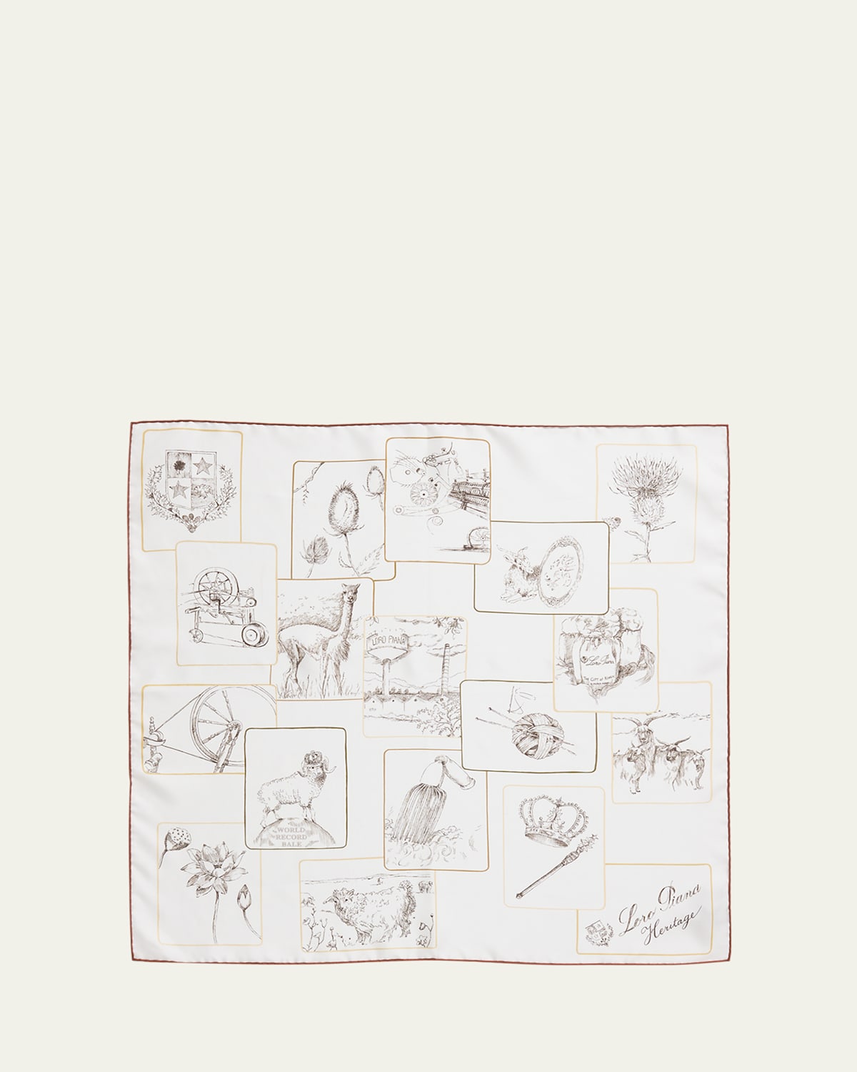 Loro Piana foulard emblazoned with a print celebrating the house's centurylong legacy Approx. 23.6"Sq. Handrolled edges Heritage print with logo Silk Dry clean Made in Italy