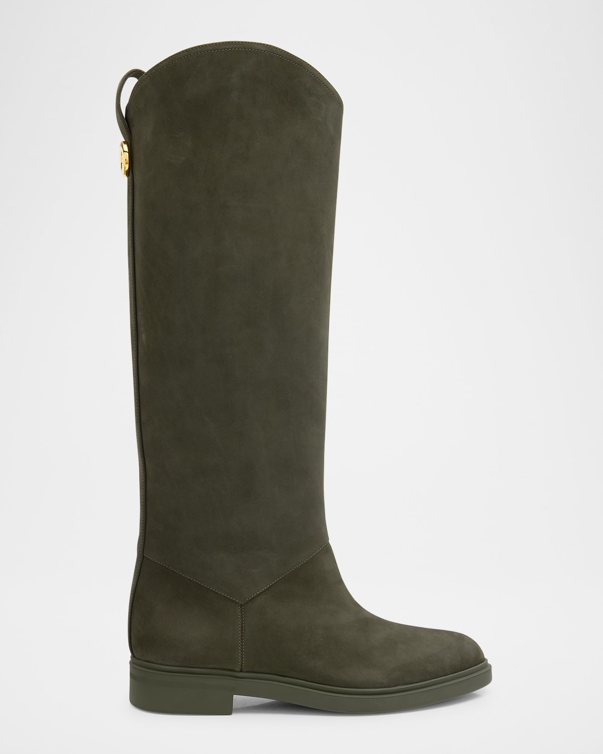 Boasting a classic equestrianstyle silhouette, the "Kilda" kneehigh boots by Loro Piana are crafted from supple calf suede with a 0.75 in / 20 mm stacked flat heel Round toe Pulltab with logoengraved golden back detail Pullon style Leather lining Tonal nonslip rubber outsole Wipe clean Made in Italy