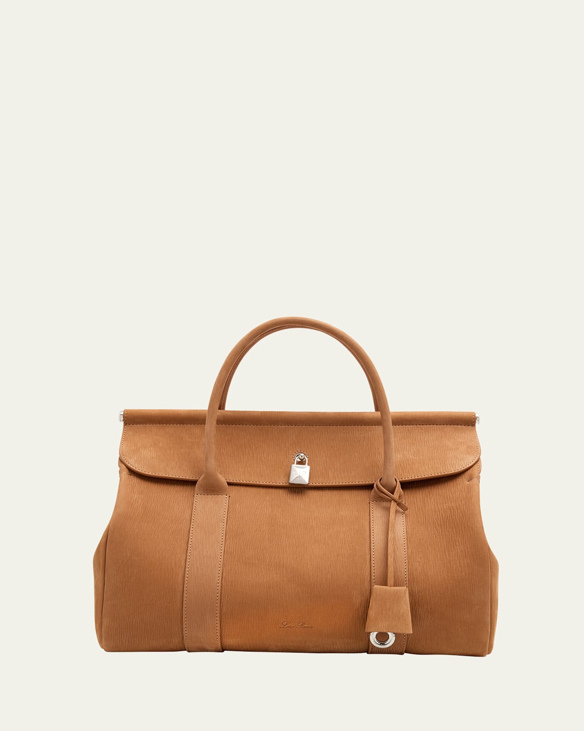 This Loro Piana "Loom" tophandle bag is crafted in richly textured nubuck zibeline leather, finished with polished topstitching and a metal bar accent under the flap for a touch of structure Rolled top handles, 3.5" drop Flap top with prong and padlock closure Detachable bag tag with padlock accent Interior, removable zip top pouch, one slip pocket Lining: Leather Feet protect the bottom of the bag Approx. 9.4"H x 12.6"W x 6.7"D Made in Italy