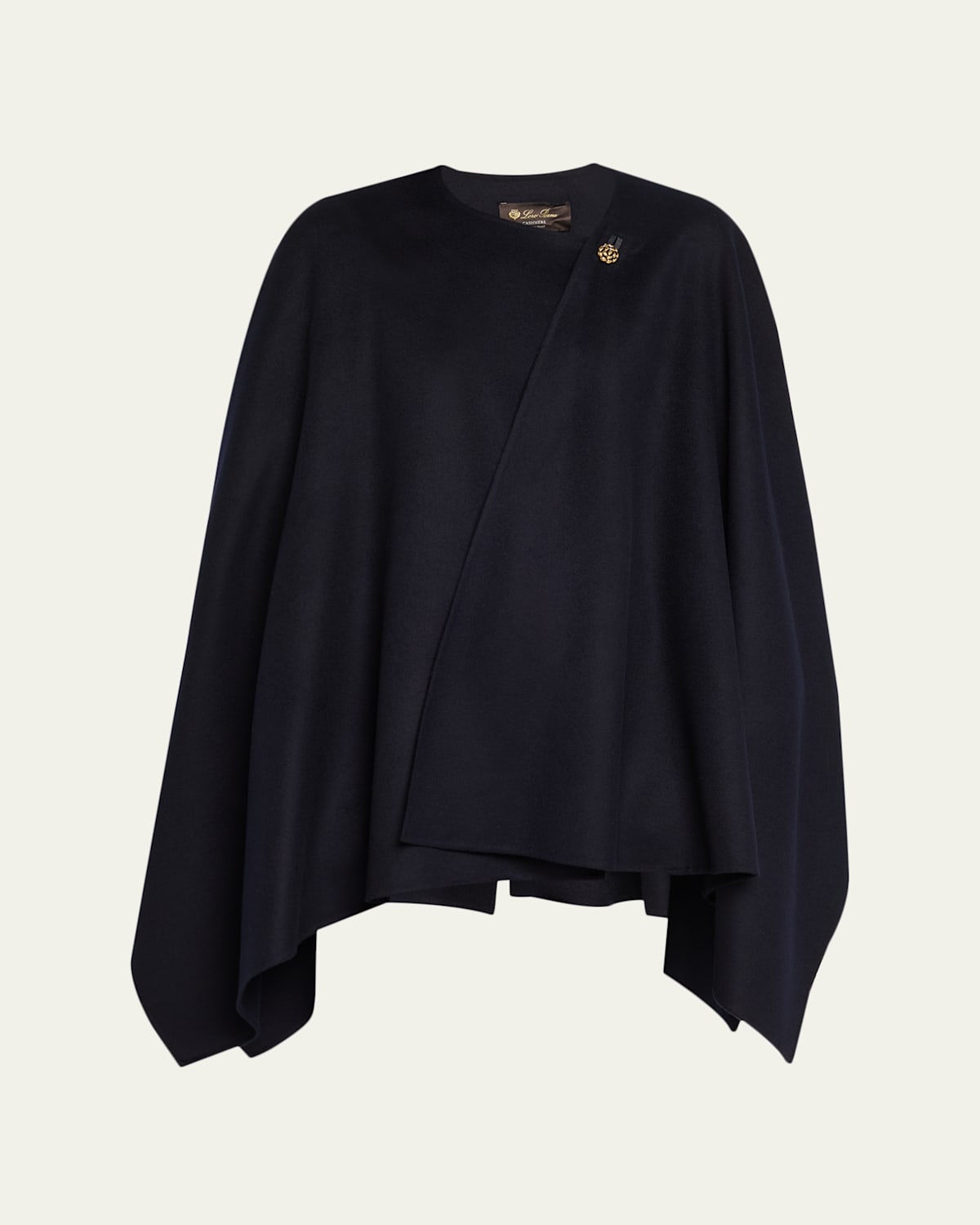 Loro Piana "Renata" doubleface cape complete with goldtone thistle button closure Round neckline Cape sleeves Asymmetric hem Cashmere Dry clean Trim: Leather Made in Italy