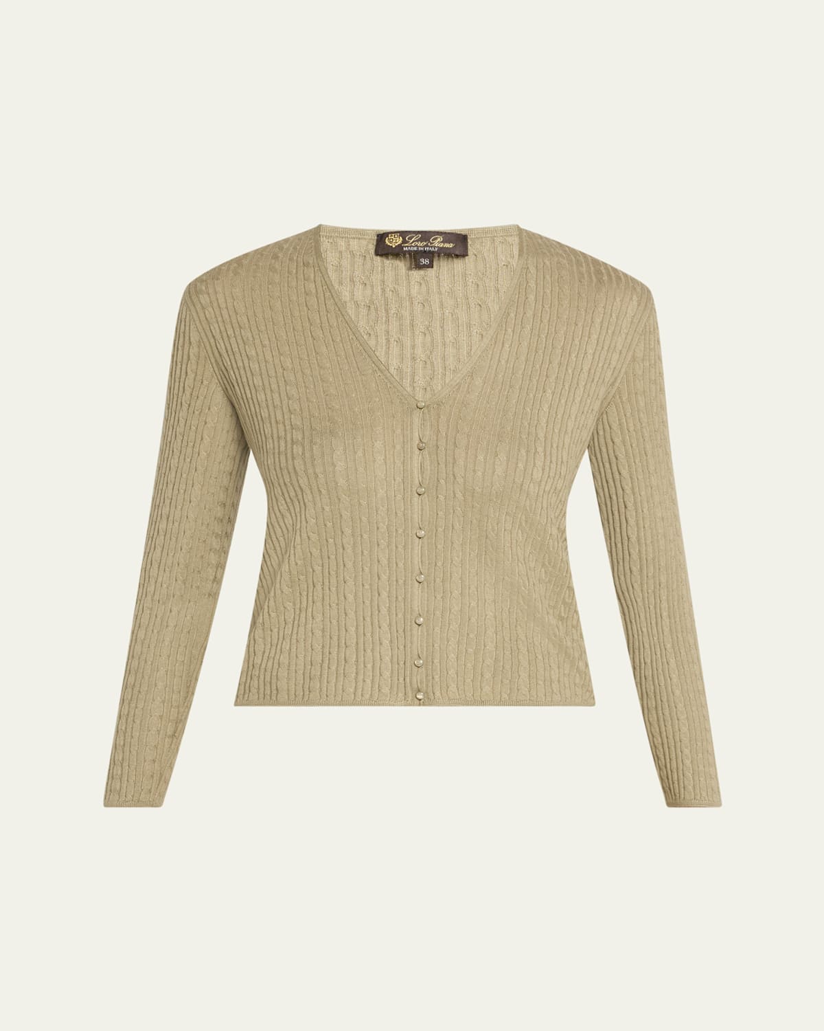 Loro Piana "Rimella" cableknit cardigan in a cashmeresilk blend V neckline Long sleeves Classic fit Hem sits at the hip Buttonfront Cashmere/silk Made in Italy
