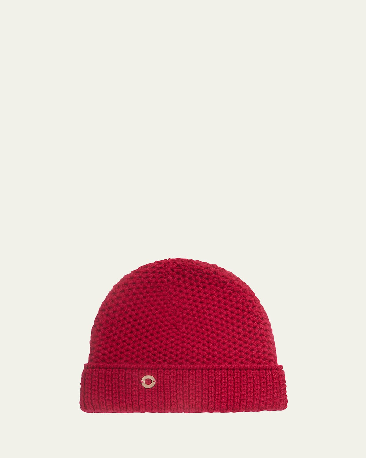 Loro Piana chain knit cashmere beanie. Folded cuff keeps hat in place. Golden logo charm at band. Made in Italy.