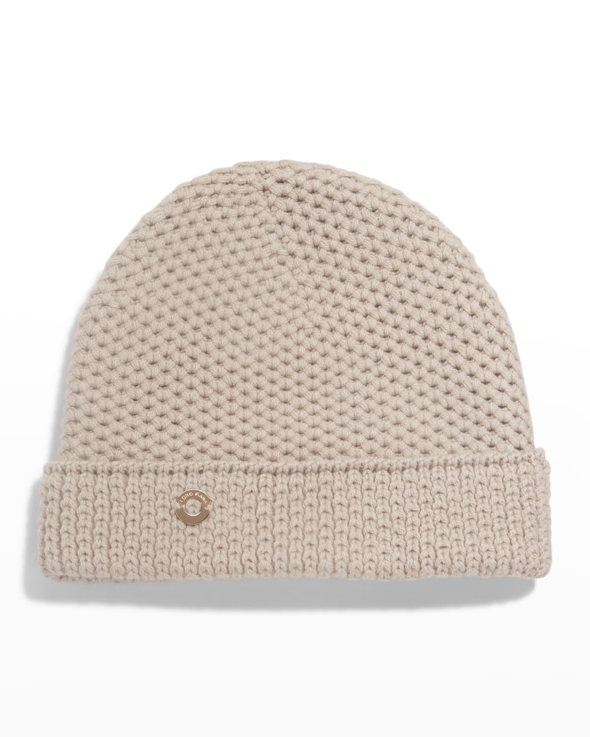 Loro Piana chain knit cashmere beanie. Folded cuff keeps hat in place. Golden logo charm at band. Made in Italy.