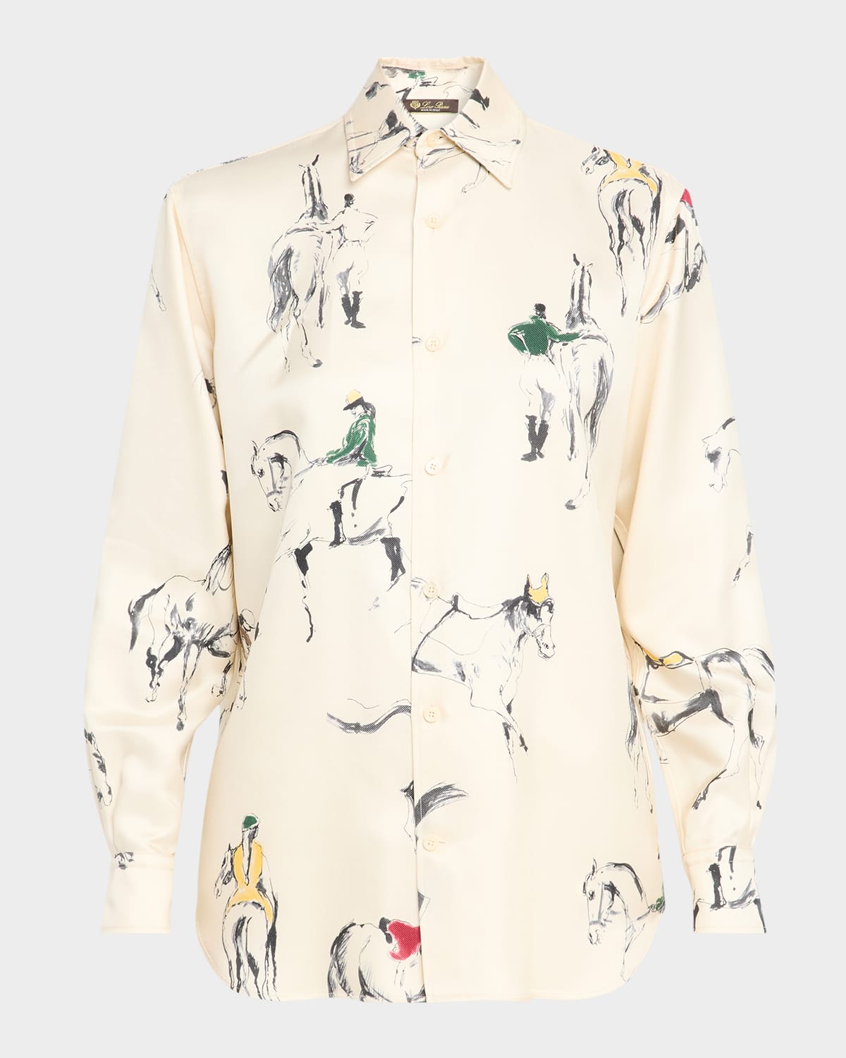 Loro Piana "Thea" shirt crafted of a fluid silk satin with a horse sketch print Point collar; button front Long sleeves; button cuffs Relaxed fit Shirttail hem Silk/cotton Made in Italy
