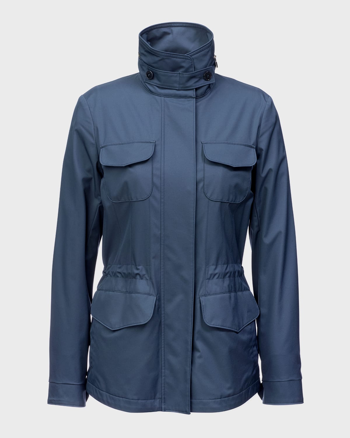 Loro Piana "Traveler" jacket in lightweight, creaseresistant Windmate® microfiber and cashmere blend. Storm System® treatment for a waterproof, windresistant finish. Approx. 26.8"L from shoulder to hem. Spread collar with packable drawstring hood. Zip front with concealed snapover placket. Internal drawstring waist. Four front flap pockets. Nylon; lining, cashmere. Dry clean. Made in Italy.