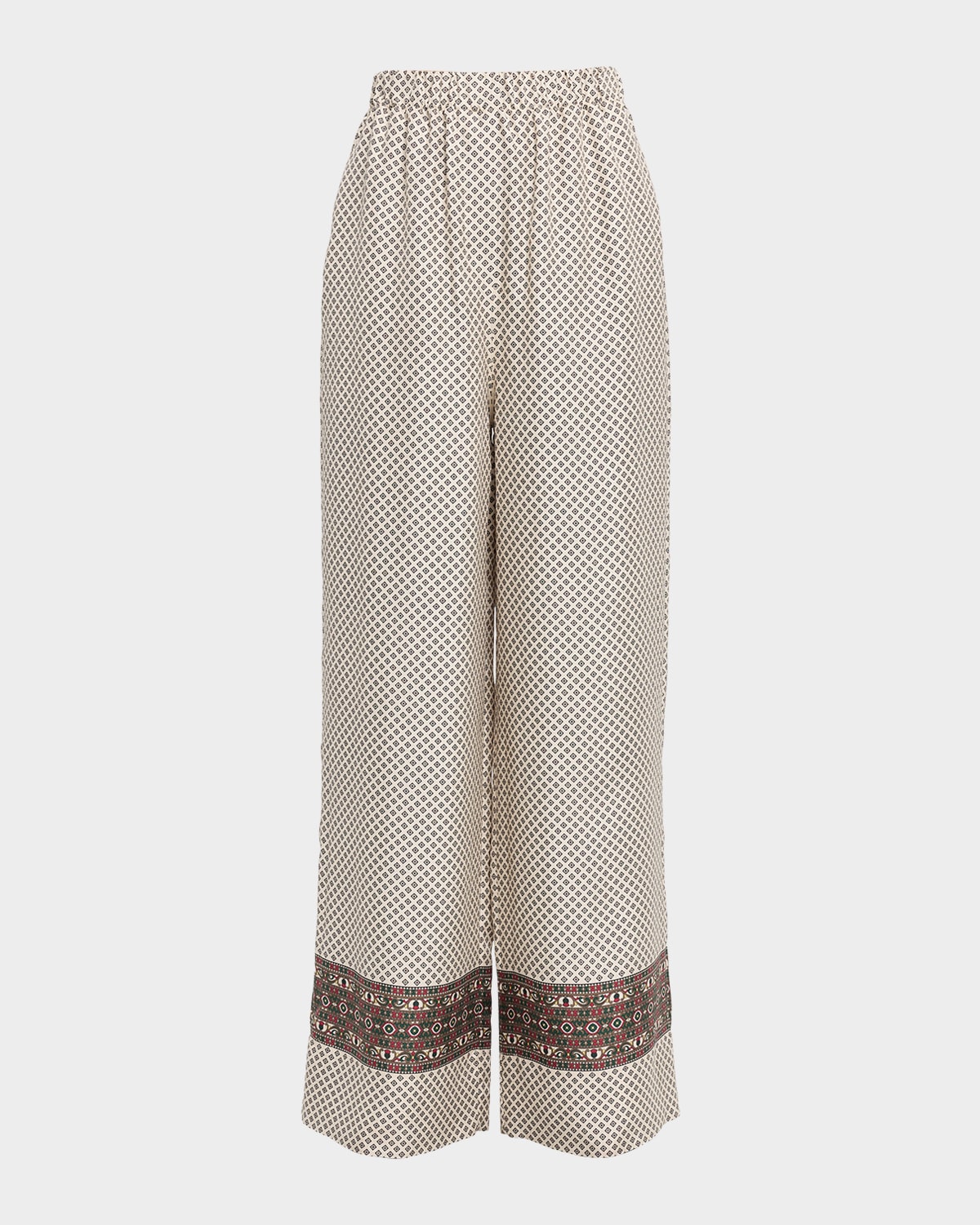 Loro Piana "Valerio" silk trousers finished with a geometric print and an elasticized waistband High rise Relaxed straight legs Full length Pullon style Silk Dry clean Made in Italy