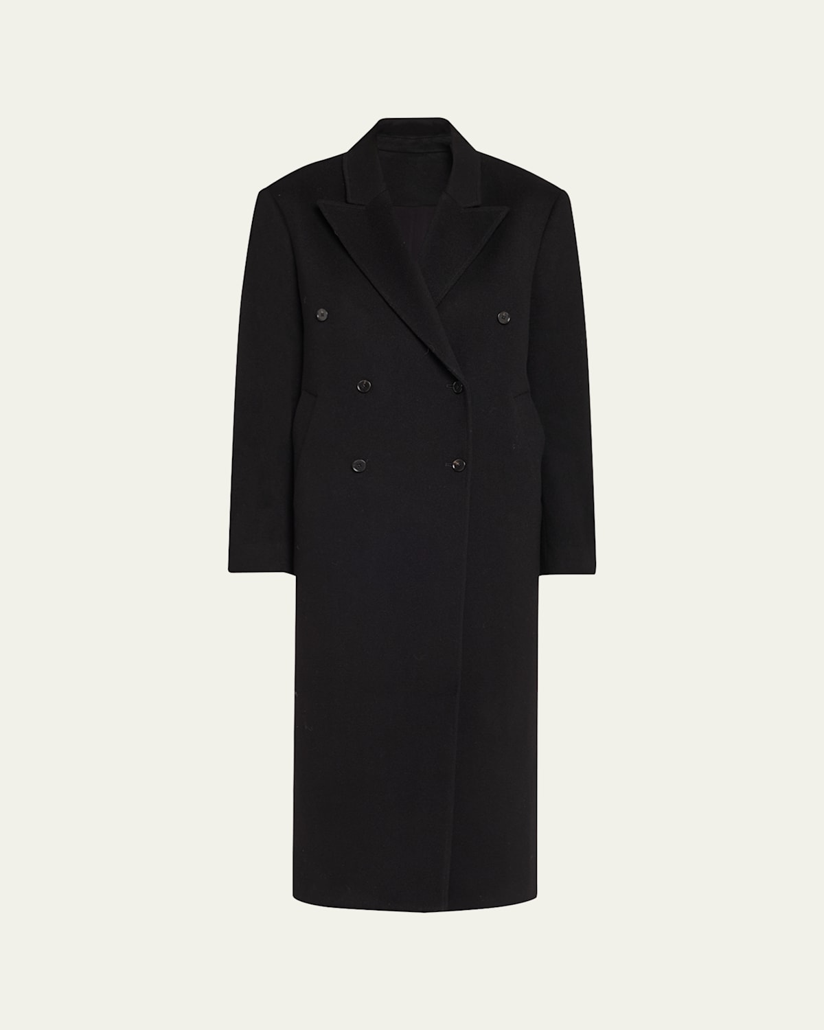 Loulou Studio "Rosco" coat in brushed cashmereblend Peka lapels; doublebreasted front Long sleeves; button cuffs Padded shoulders Hip welt pockets Straight fit Full length Walking vent back Button closure Wool/cashmere Dry clean Made in Romania