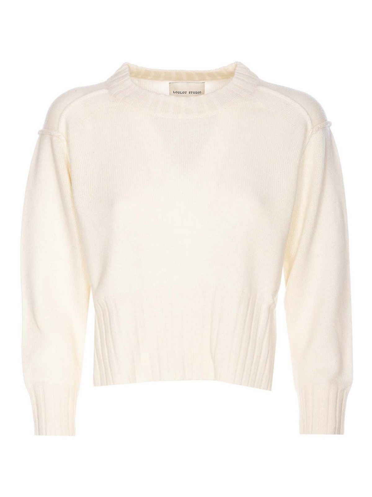 Pull Loulou Lian blanc à col rond et manches longues fendues sur le côté, logo brodé sur le