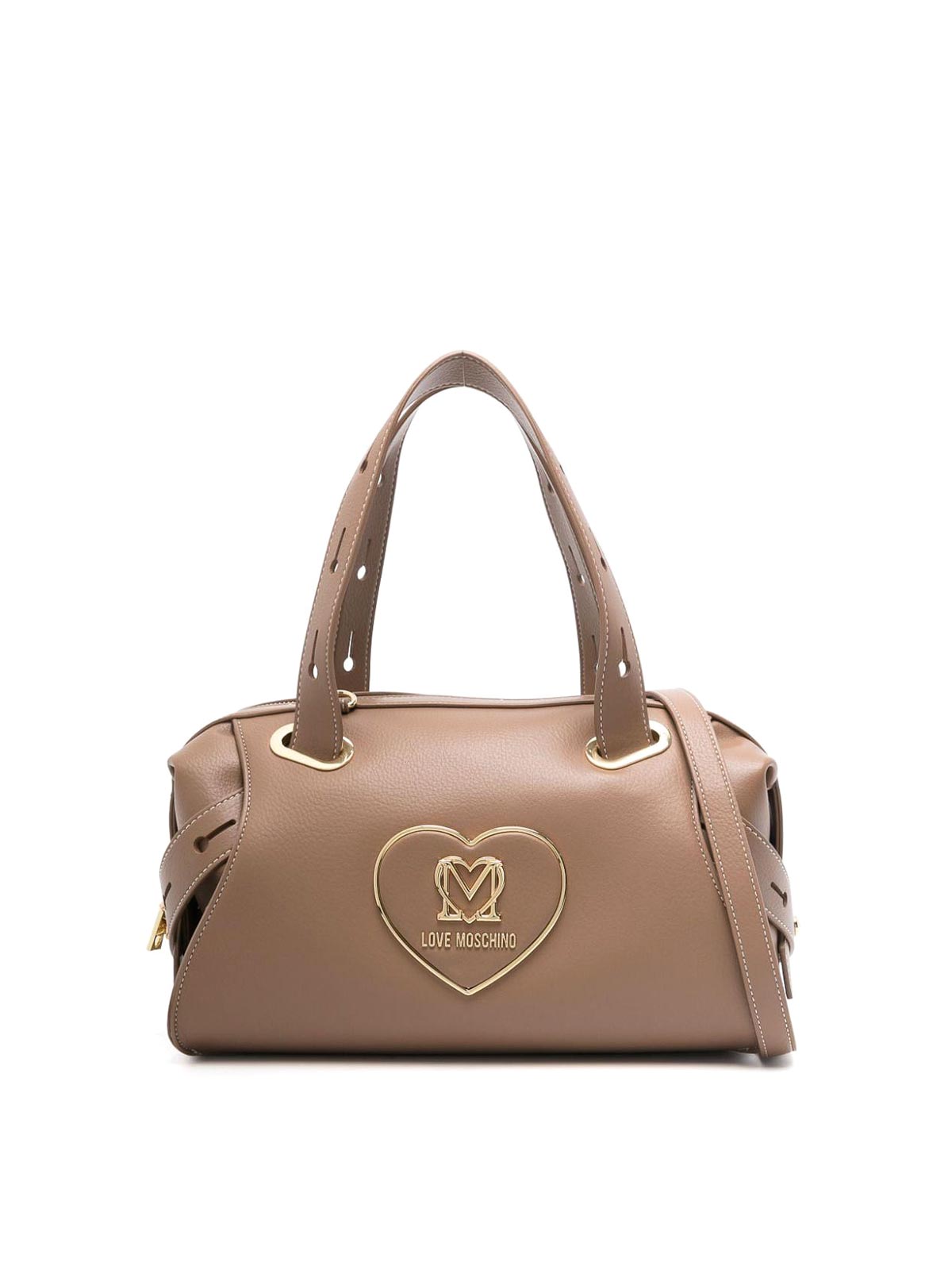 Texture en faux galets marron taupe, deux poignées supérieures, bandoulière amovible et ajustable, plaque logo, bretelles latérales réglables, compartiment principal, fermeture éclair, poche plaquée avec logo, fermeture éclair sur le dessus