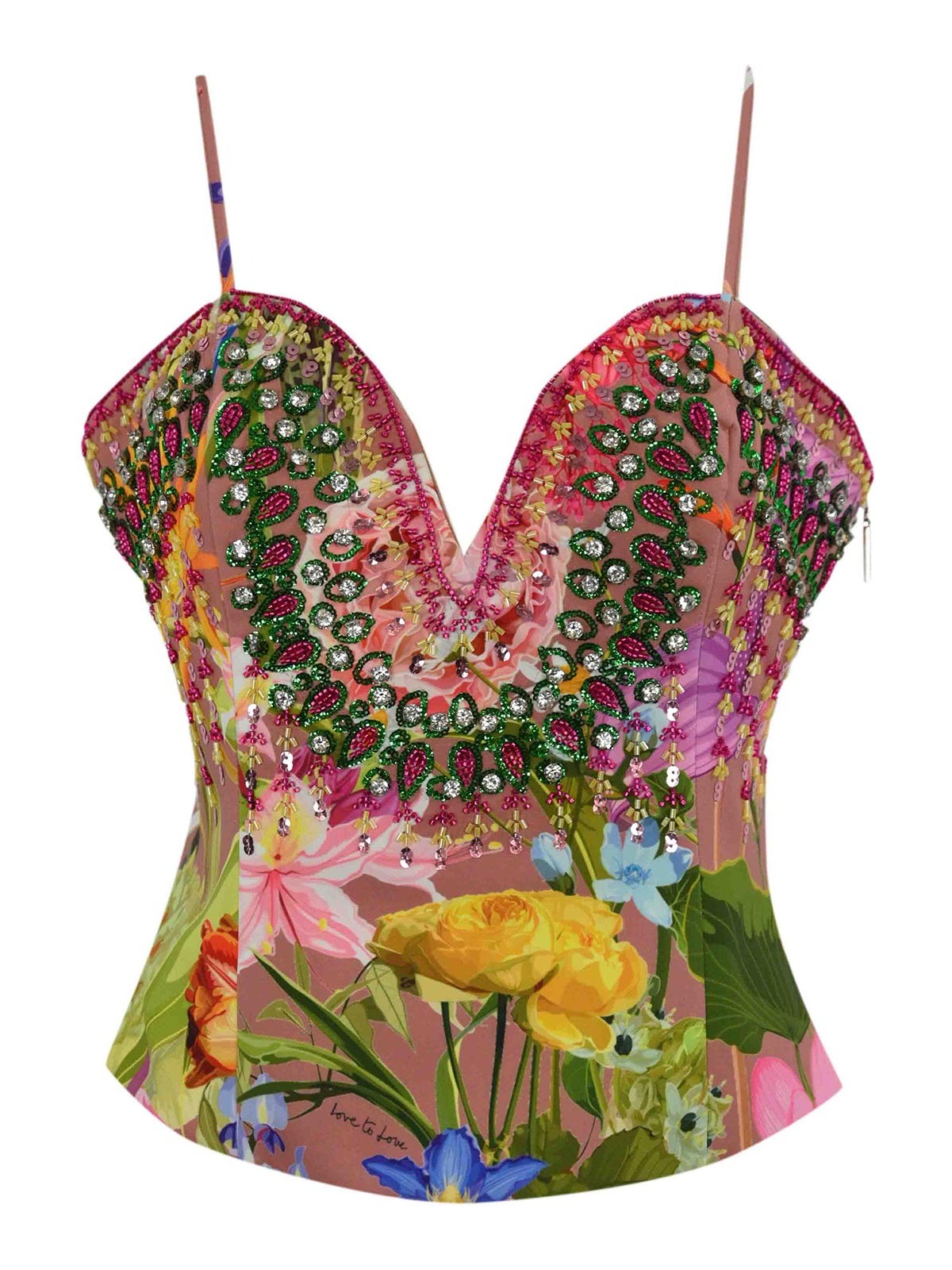 Crêpe sans manches, encolure en caur, fermeture éclair latérale désossée, imprimé floral avec strass et ourlet incurvé, coupe ajustée