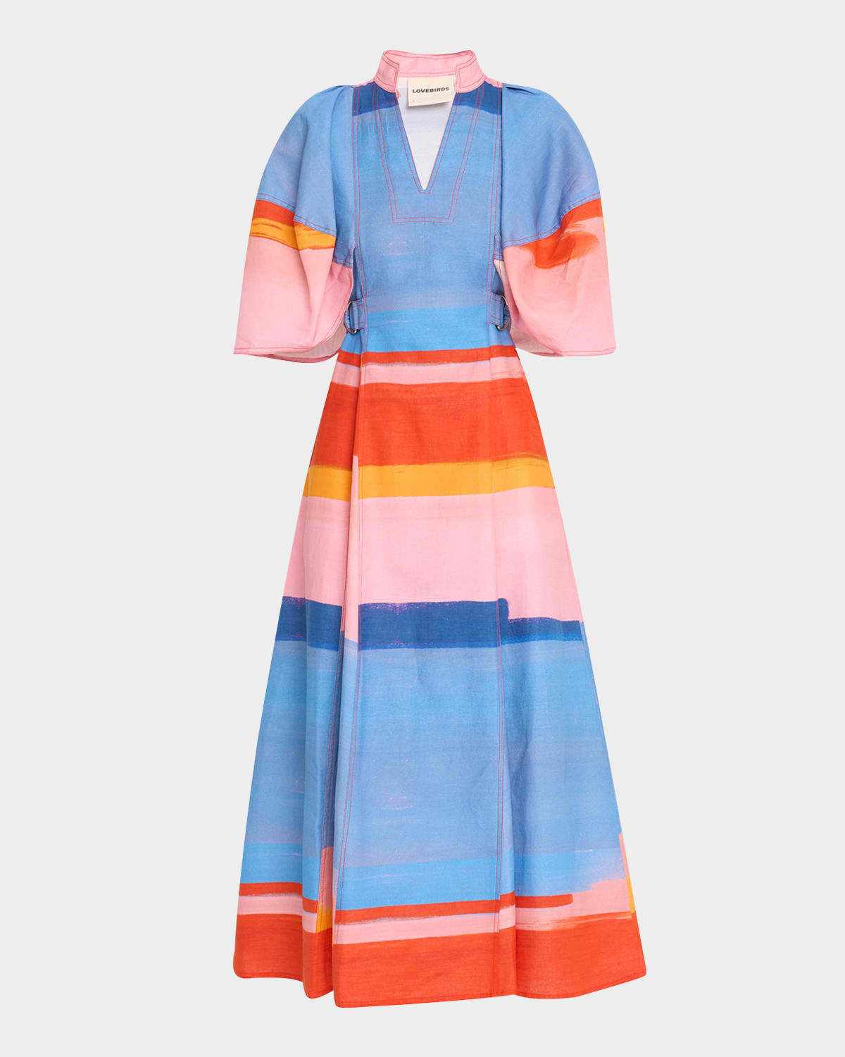 LOVEBIRDS "Miami" midi dress with brushed stripes Approx. 52"L from shoulders to hem V neckline 3/4 cape sleeves Dring waist tabs Onseam pockets Hem falls below the knee Aline silhouette Linen/cotton Dry clean Imported