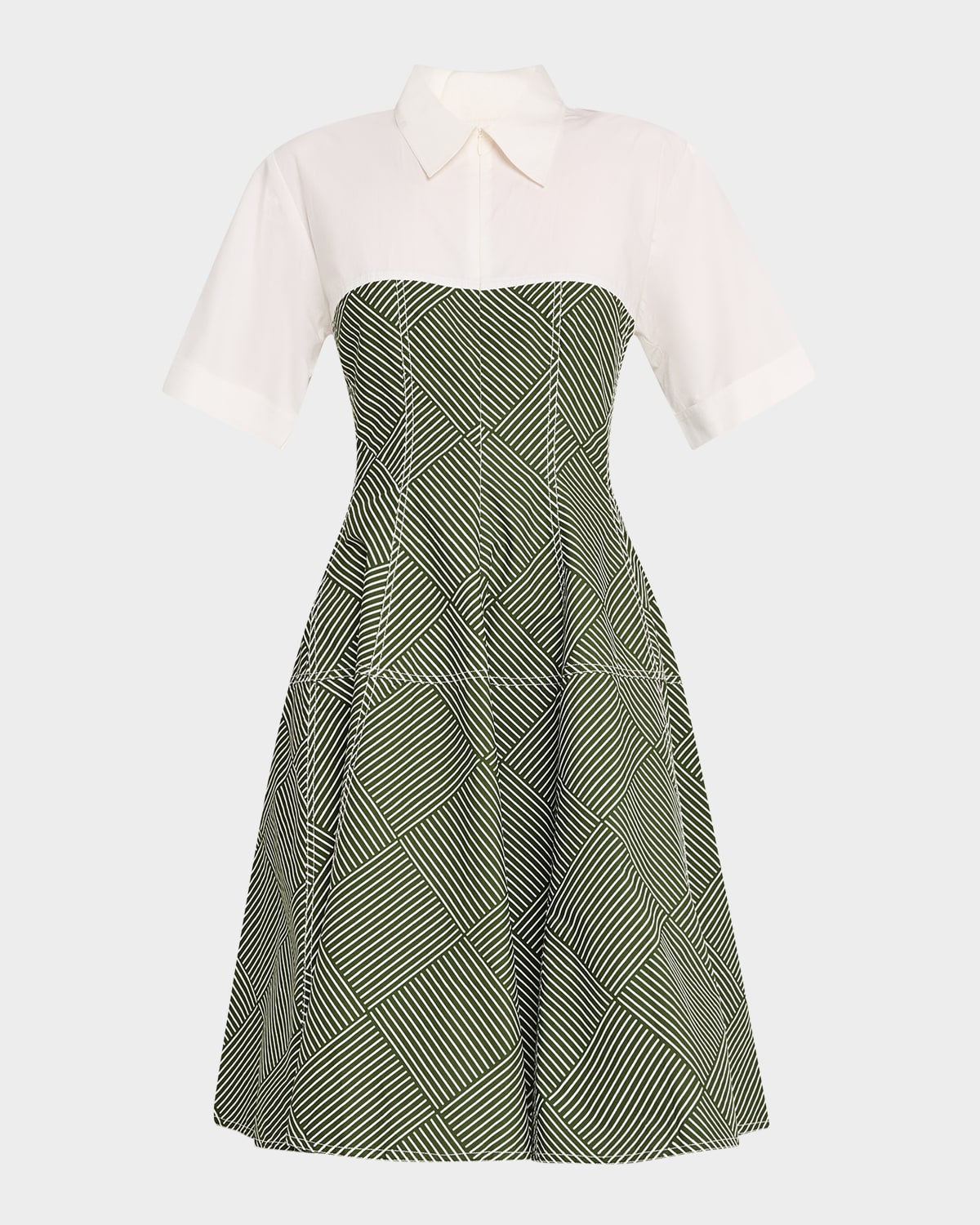 LOVEBIRDS "Osaka" shirtdress in a hatched stripe print Approx. 40"L from shoulders to hem Point collar; concealed button front Short sleeves Onseam pockets Hem hits around the knee Aline silhouette Cotton Dry clean Imported