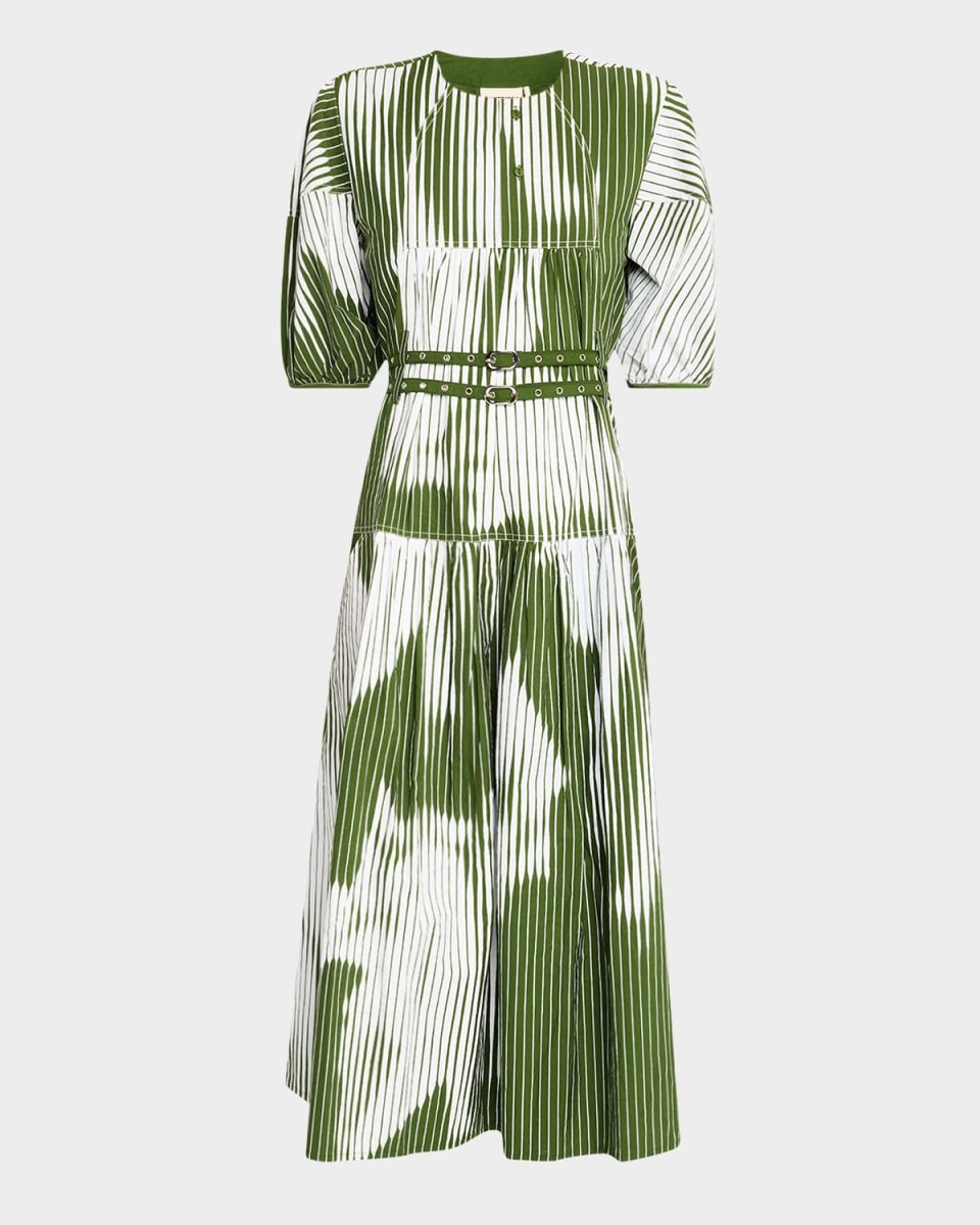 LOVEBIRDS "The Diana" midi dress in an abstract wavy stripe print Approx. 48"L from shoulders to hem Crew neckline Elbow puff sleeves Double belted waist Side slant pockets Hem falls below the knee Aline silhouette Cotton Dry clean Imported