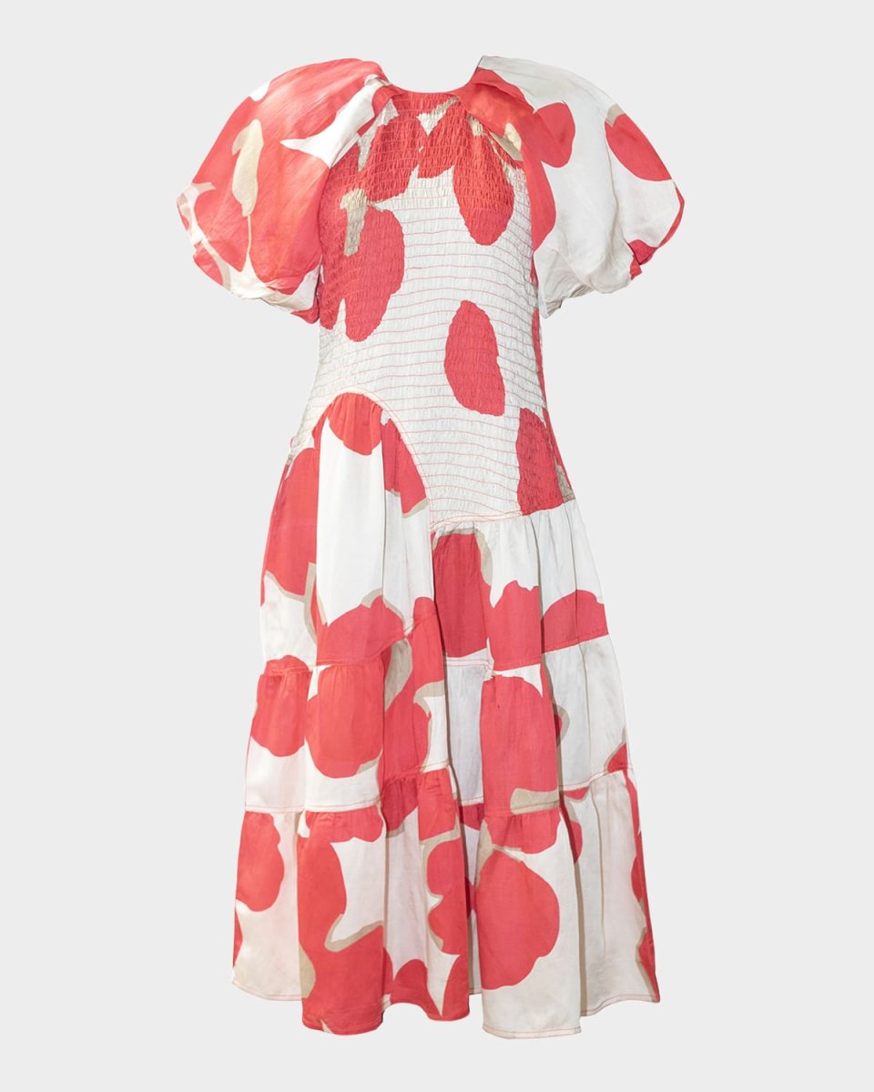 LOVEBIRDS "Valencia" tiered midi dress in a floral print Asymmetric stretchy smocked bodice Approx. 50"L from shoulders to hem Jewel neckline Raglan elbow puff sleeves Hem falls below the knee Aline silhouette Invisible back zipper Rayon/cellulose acetate/linen Dry clean Imported