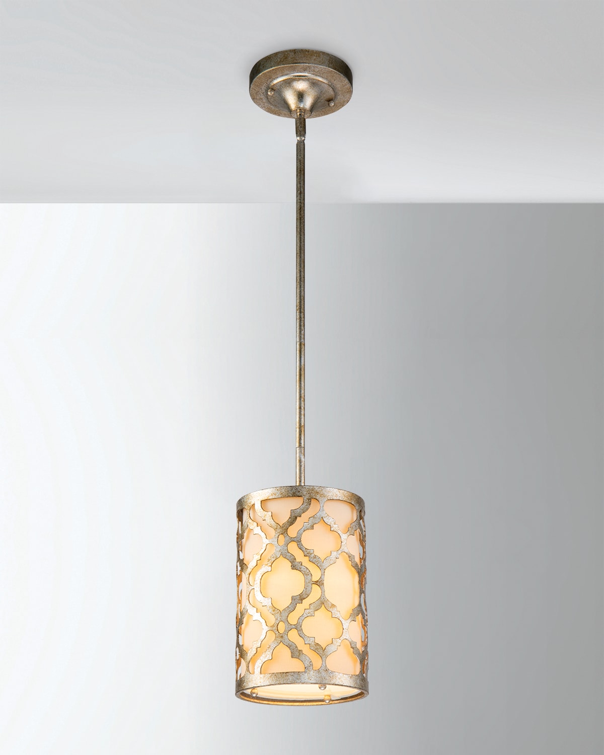 Quatrefoil cutout lighting pendant made of metal. Overall: 7"Dia. x 10"T. Cord length: 8 ft. Drop height: 15.554"T. Uses one 75watt medium based, 120V bulbs. UL listed. Assembly required. Imported. Boxed weight, approximately 7 lbs.