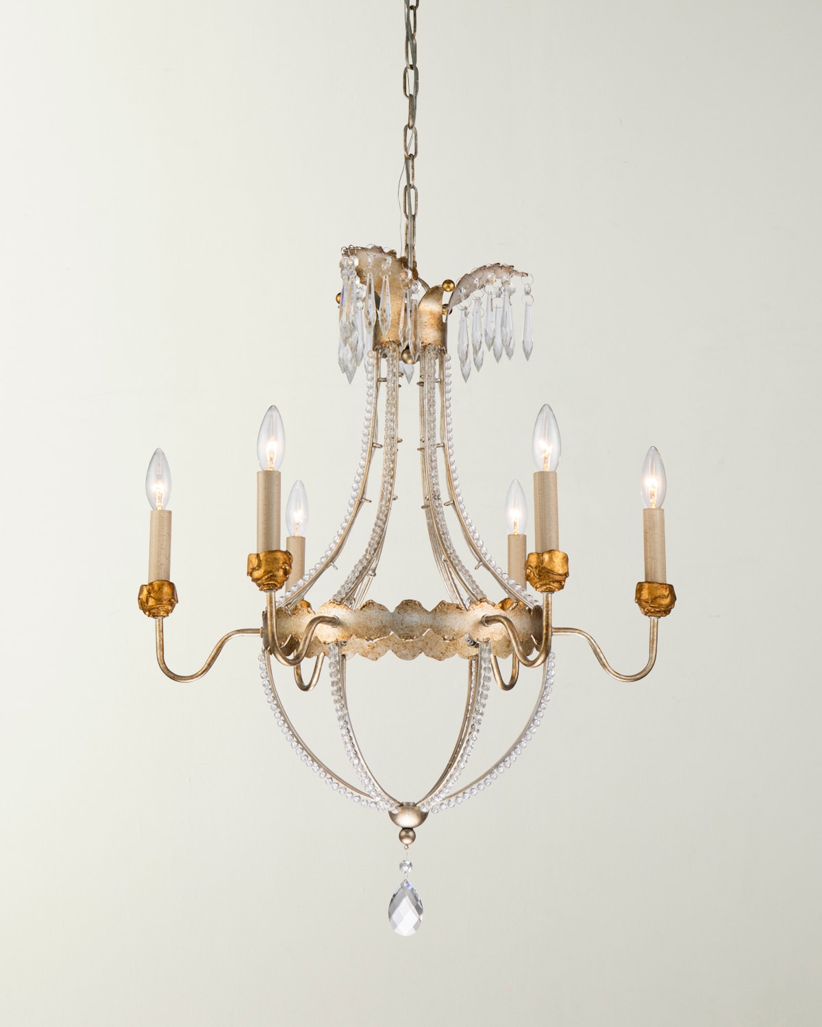 Metal chandelier with crystal drops. Approx. 25"Dia. x 27"T. Uses six 60watt candelabra base, 120V bulbs. UL listed. Assembly required. Imported. Boxed weight, approximately 21 lbs.