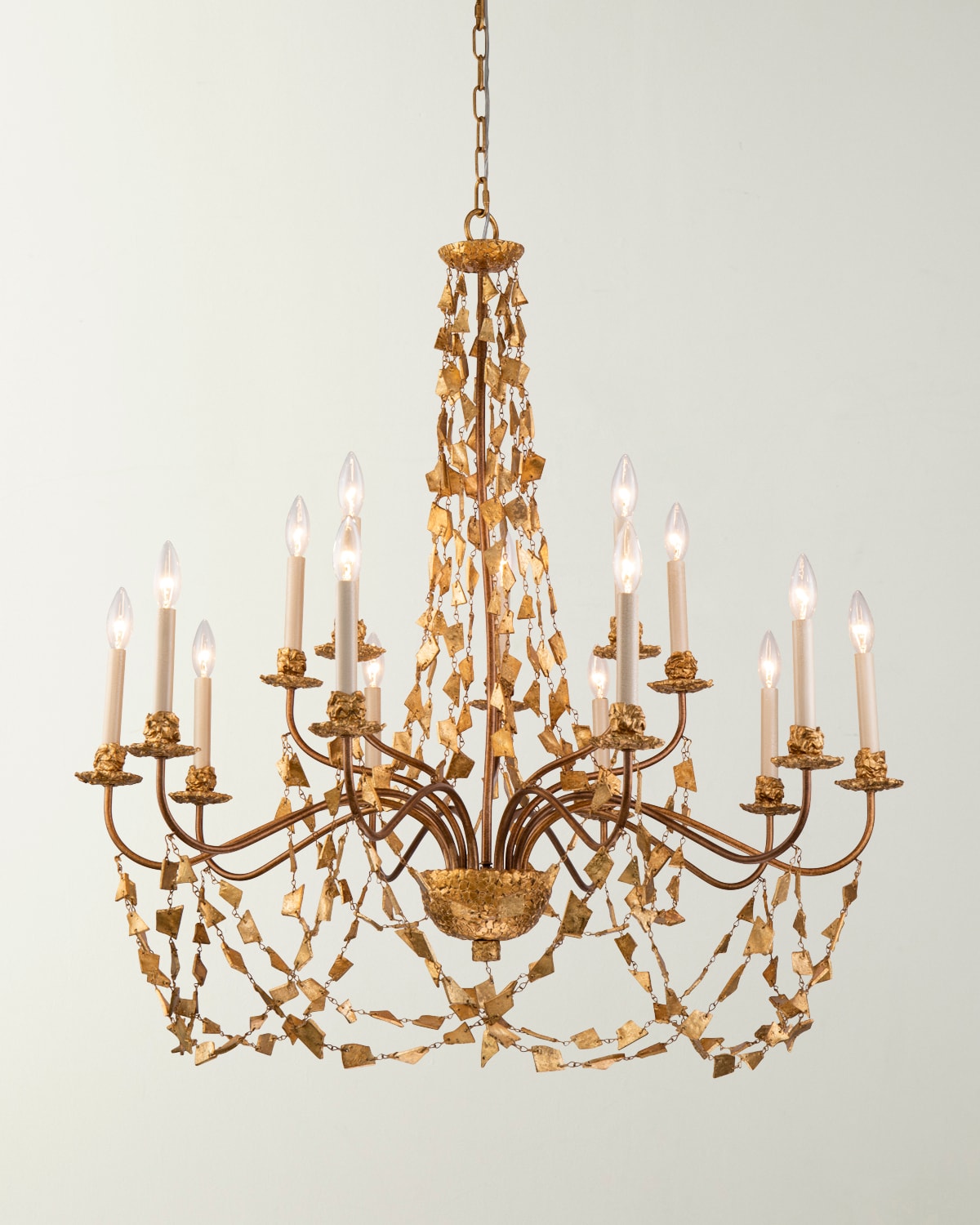 Metal chandelier with gold leaf finish. Approx. 37"Dia. x 43"T. Uses 15 60watt candelabra base, 120V bulbs. UL listed. Assembly required. Imported. Boxed weight, approximately 31 lbs.