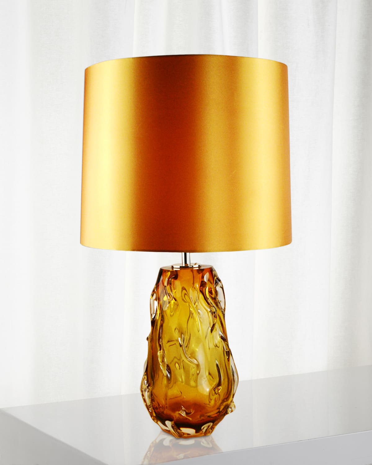 Table lamp made of glass. Shade: 14"Dia. x 13.5"T. Overall: 14"Dia. x 30"T. Uses one 100watt medium based, 120V bulb. UL listed. Assembly required. Imported. Boxed weight, approximately 14 lbs.