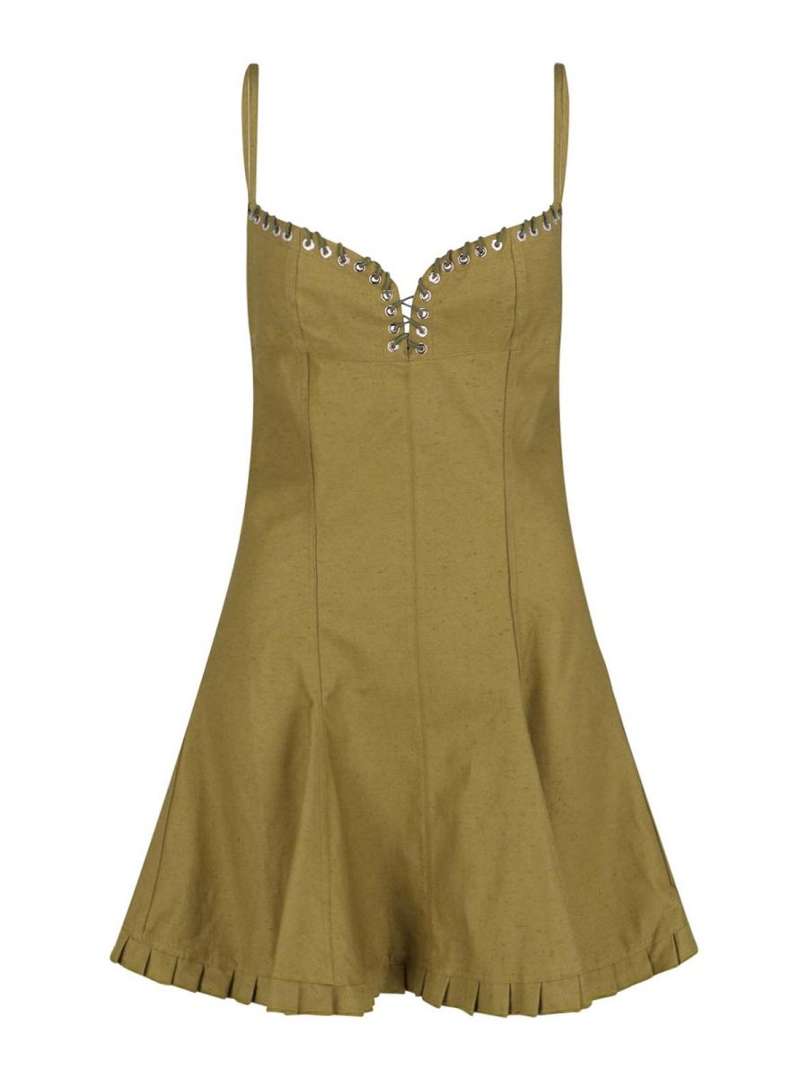 Mini-robe évasée verte Ludovic de Saint Sernin, encolure en caur, lacets, fines bretelles, ourlet évasé, ourlet droit