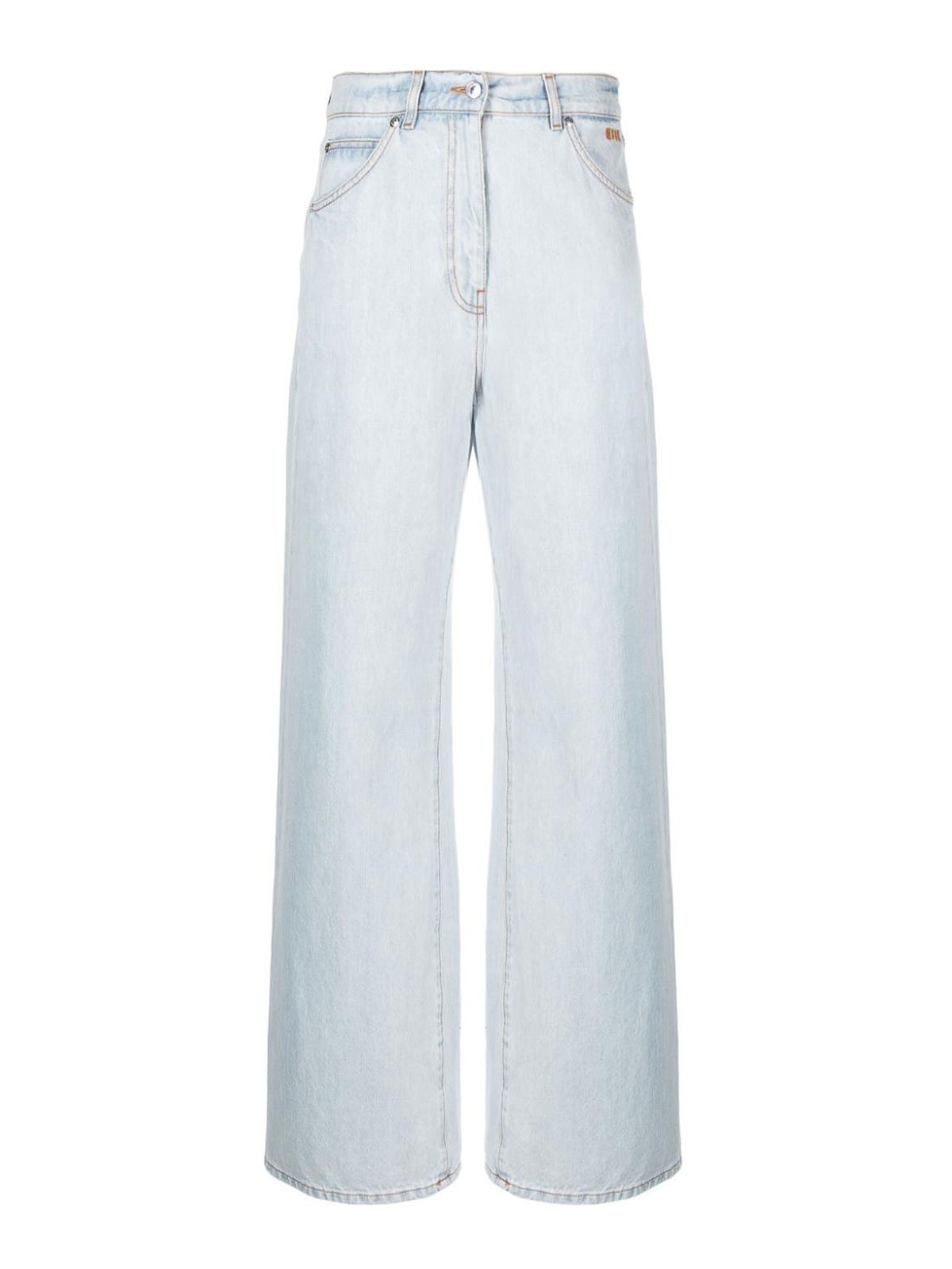 Jean taille haute, bleu jean clair, logo appliqué, avec rabat et boutons cachés, jambe large, passants de ceinture, cinq poches