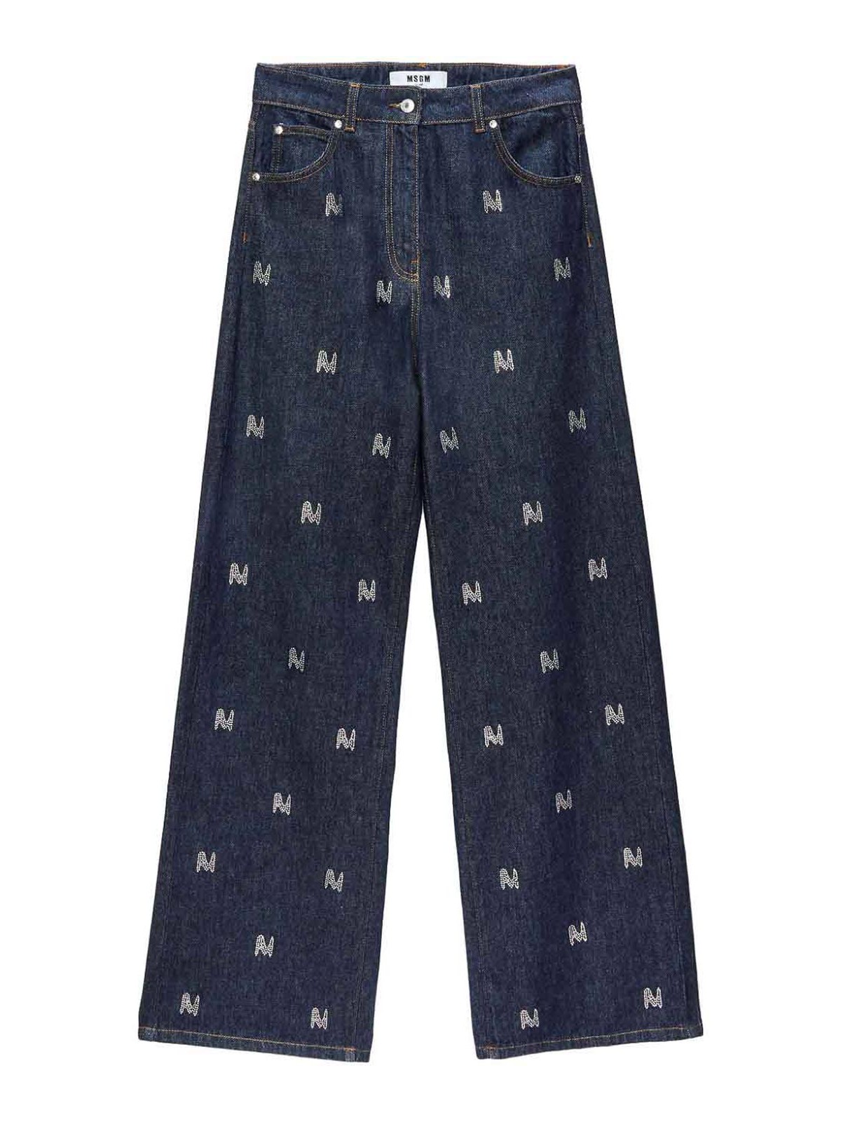 Passe-ceinture à logo appliqué en jean bleu, braguette et bouton dissimulés, jambe large, cinq poches classiques