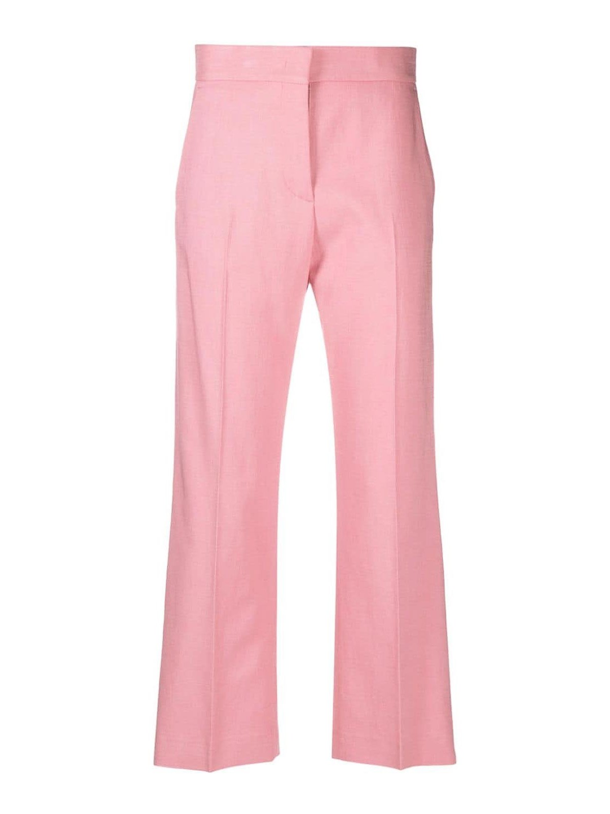 Finition texturée rose, braguette à crochet et fermeture éclair, taille ajustée, deux poches latérales, deux poches arrière passepoilées, pli pressé, jambe droite, jambe courte