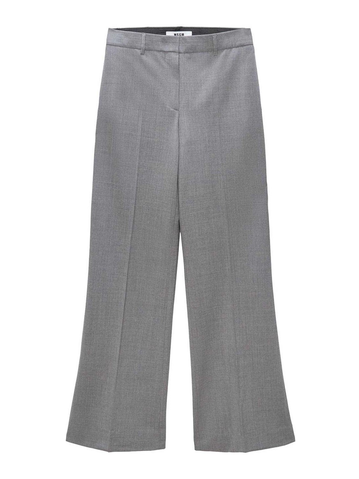 Passants de ceinture gris à plis pressés, hauts, cintrés et dissimulés, deux poches latérales fendues, deux poches arrière passepoilées, jambe droite