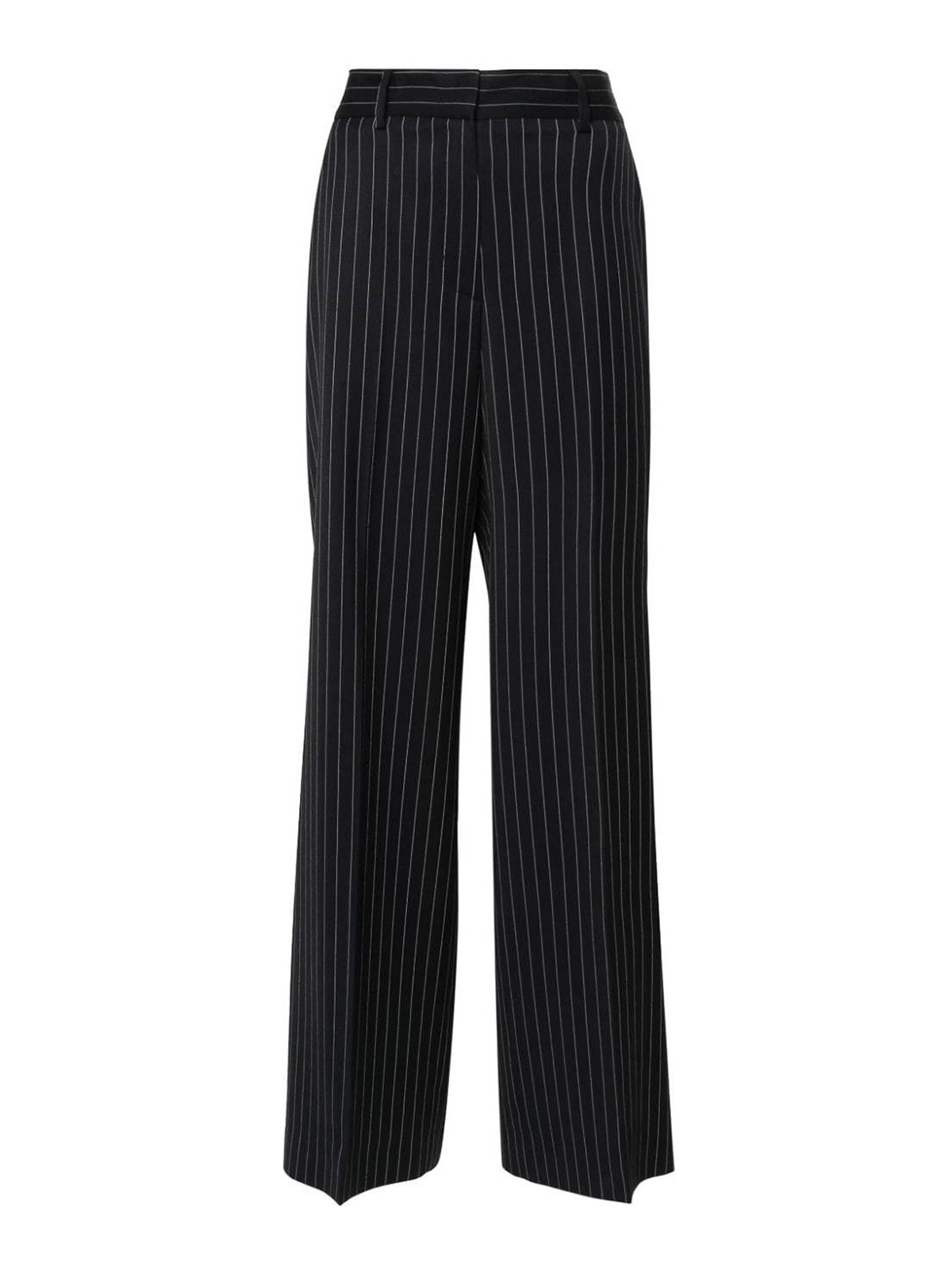 Pantalon à fines rayures, bleu marine, passants de ceinture, taille haute, deux poches diagonales sur les côtés, deux fausses poches au dos, pli repassé, jambe droite non doublée, avec boutons cachés, crochet et fermeture éclair
