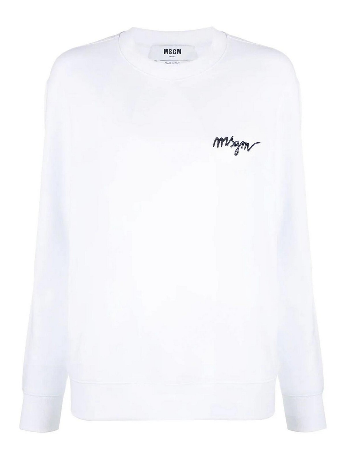 Sweat-shirt à encolure ronde blanche, logo brodé sur la poitrine, ourlet droit et manches longues